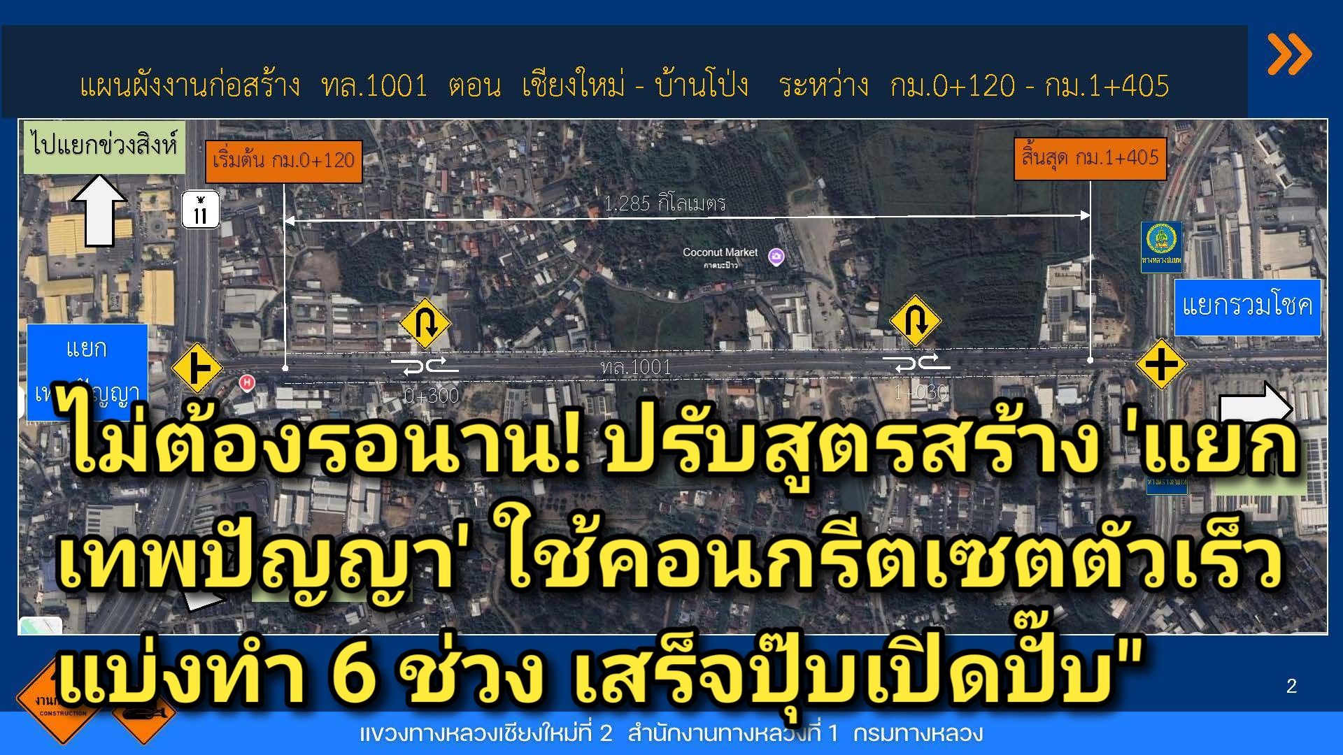 นายสิทธาฤทธิ์ ปรีดานนท์ ผู้อำนวยการแขวงทางหลวงเชียงใหม่ที่ 2 กล่าวถึง โครงการก่อสร้างผิวทางคอนกรีตทางหลวงหมายเลข 1001แยกเทพปัญญา-แยกรวมโชค ว่า โครงการนี้เป็นโครงการปรับปรุงทางหลวงหมายเลข 1001 ช่วงแยกเทพปัญญาถึงแยกรวมโชค ส่วนที่มาที่ไปของโครงการก็เนื่องมาจากสภาพผิวทางในช่วงนี้มีสภาพผิวทางที่ชำรุดเสียหายค่อนข้างเยอะมาก จะเห็นได้ว่าตลอดเส้นทางช่วงนี้จะมีรอยปะซ่อมอยู่หลายจุดมาก โดยที่การก่อสร้างปรับปรุงล่าสุดทำมานานแล้ว ตั้งแต่ปี 2552 ด้วยการปรับปรุงพื้นทางโดยผสมซีเมนต์เข้าไป แล้วก็ทำผิวยางแอสฟัลต์หนา 5 ซม. ซึ่งผิวยางที่มีความหนาแค่ 5 ซม. ไม่สอดคล้องกับปริมาณการจราจรที่มีมากขึ้น ก่อนที่จะเริ่มโครงการนี้ ได้มีการบำรุงรักษามาเป็นระยะๆ แล้ว ก็คือ มีการฉาบผิวทางไปแล้ว 2 ครั้ง โดยมีการฉาบผิวล่าสุดเมื่อ 10 ปีที่แล้ว ราวปี 2559 ตอนเนี้ยสภาพผิวทางเสียหายค่อนข้างเยอะ เริ่มมีการแอ่นตัว ทรุดตัว แต่ต้องรองรับปริมาณการจราจรที่เยอะขึ้น ซึ่งไม่สอดคล้องกับพื้นผิวที่เสียหาย ปริมาณรถที่สัญจรผ่านเส้นทางนี้ ราว 55,000 คันต่อวัน ปริมาณรถมากขนาดนี้ผิวทางควรเป็นผิวคอนกรีต