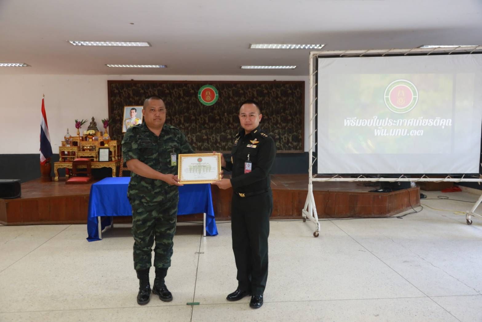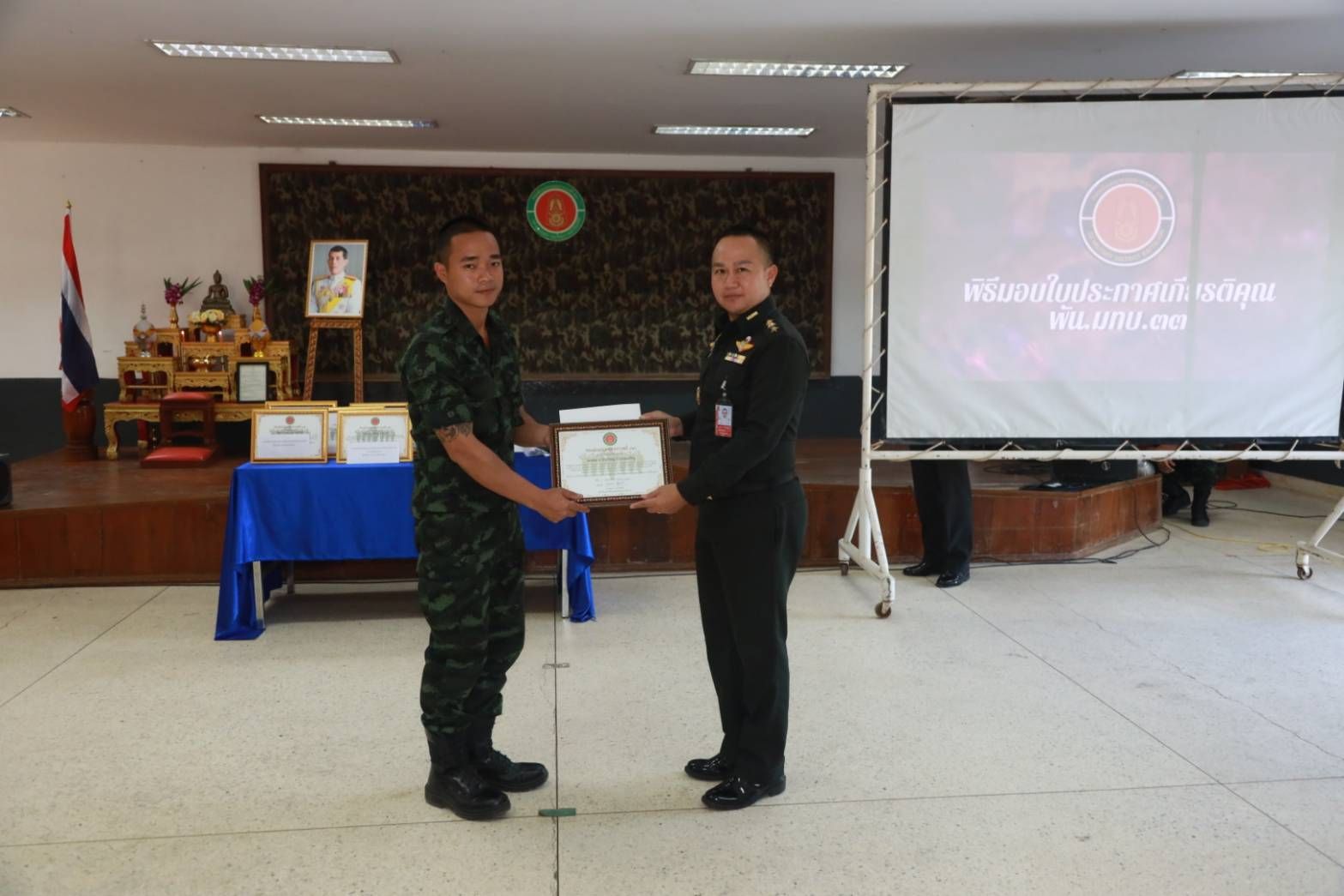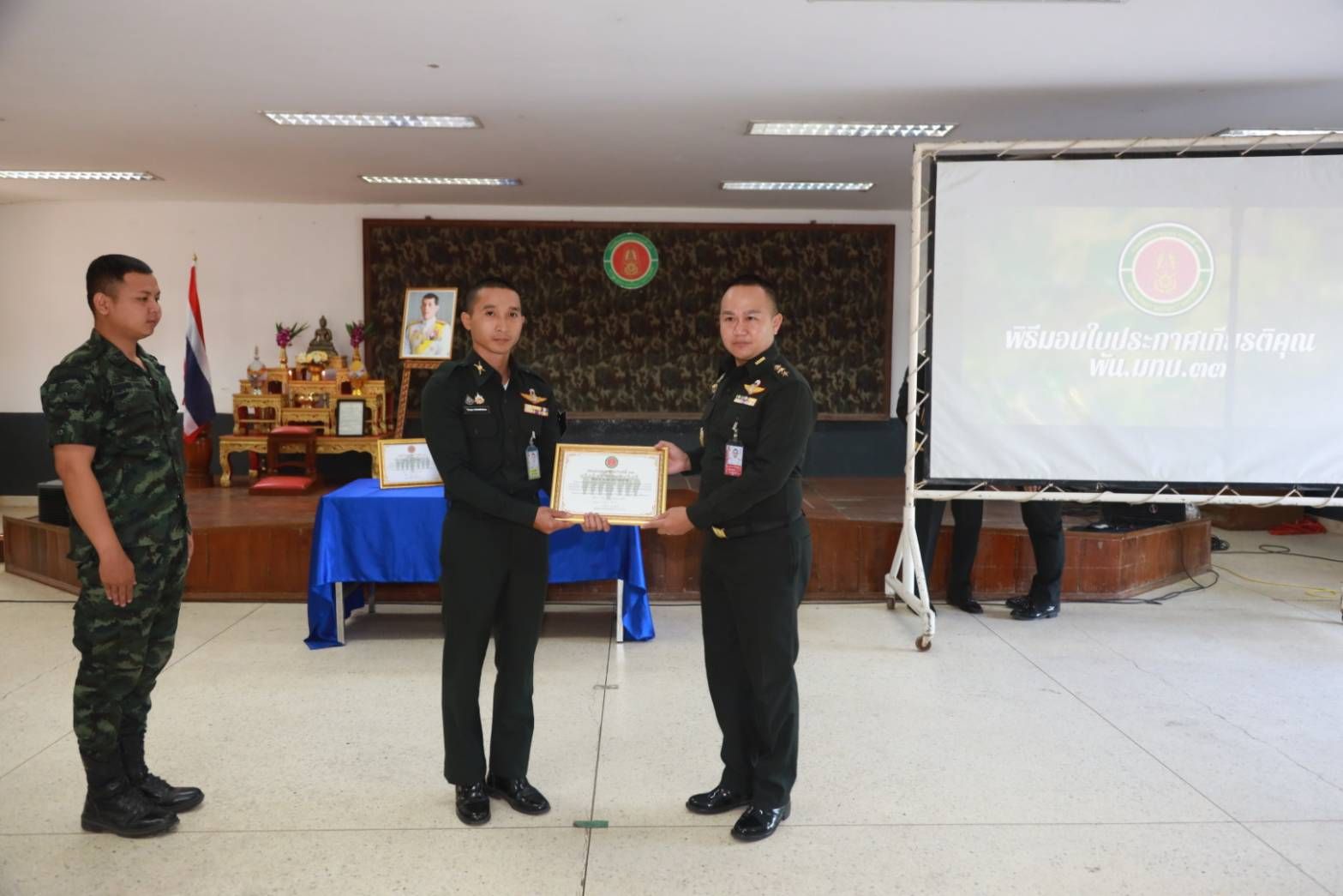 เมื่อวันที่ 18 มีนาคม 2569 เวลา 09.00 น. พ.อ.วารินทร์ คธาพันธ์ ผู้บังคับกองพันมณฑลทหารบกที่ 33 ได้มอบใบประกาศเกียรติคุณให้แก่กำลังพลที่สร้างชื่อเสียงและทำคุณประโยชน์ให้กับสังคม ทั้งด้านการศึกษาและการปฏิบัติหน้าที่ด้วยจิตอาสา