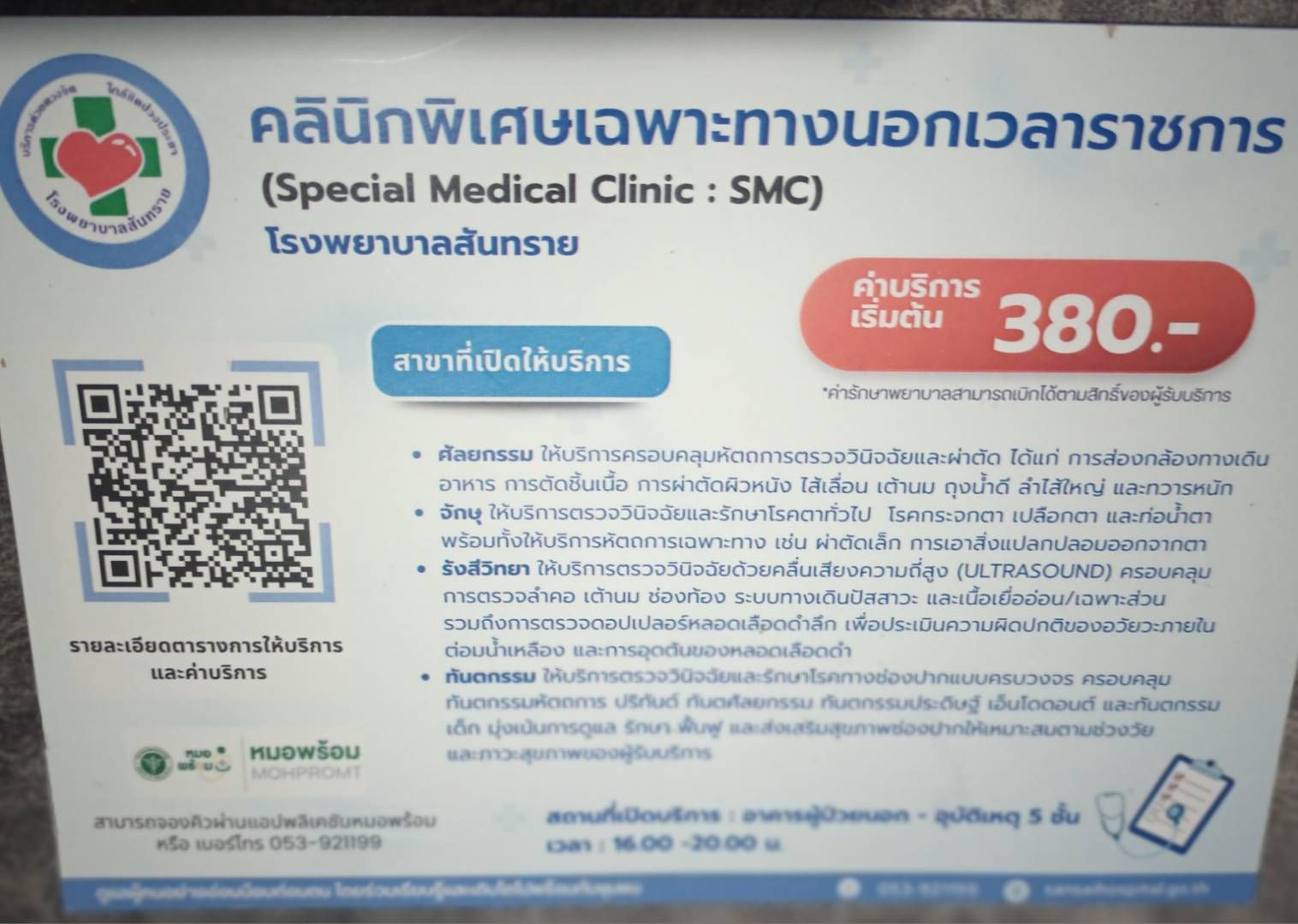สำหรับผู้ที่สนใจเข้ารับบริการคลินิกนอกเวลา มีค่าธรรมเนียมเริ่มต้นเพียง 380 บาท โดยสามารถสำรองคิวล่วงหน้าเพื่อความสะดวกรวดเร็วผ่านทางแอปพลิเคชัน “พร้อม” (Prompt)” หรือติดต่อสอบถามรายละเอียดเพิ่มเติมได้ที่หมายเลขโทรศัพท์ 053-921199 ซึ่งนับเป็นอีกหนึ่งก้าวสำคัญของโรงพยาบาลสันทรายในการมุ่งเน้นบริการที่ครอบคลุม ทั้งการรักษาเชิงรับและการดูแลเชิงรุกอย่างแท้จริง.
