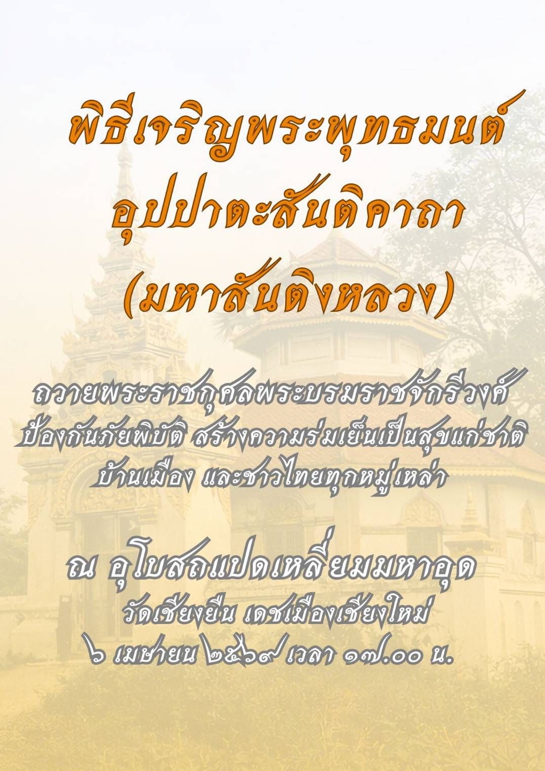 เนื่องในโอกาส วันจักรี วันอาทิตย์ที่ 6 เมษายน พุทธศักราช 2569 นี้ ขอเชิญชวนพุทธศาสนิกชนและประชาชนทุกหมู่เหล่า เข้าร่วมงานบุญครั้งสำคัญในพิธีบวงสรวงและเจริญพระพุทธมนต์บท “อุปปาตะสันติคาถา” หรือ “มหาสันติงหลวง” ณ วัดเชียงยืน (เดชเมืองเชียงใหม่) อำเภอเมือง จังหวัดเชียงใหม่ เพื่อสืบสานประเพณีล้านนาอันทรงคุณค่า และเสริมความเป็นสิริมงคลให้แก่ชีวิตและประเทศชาติ