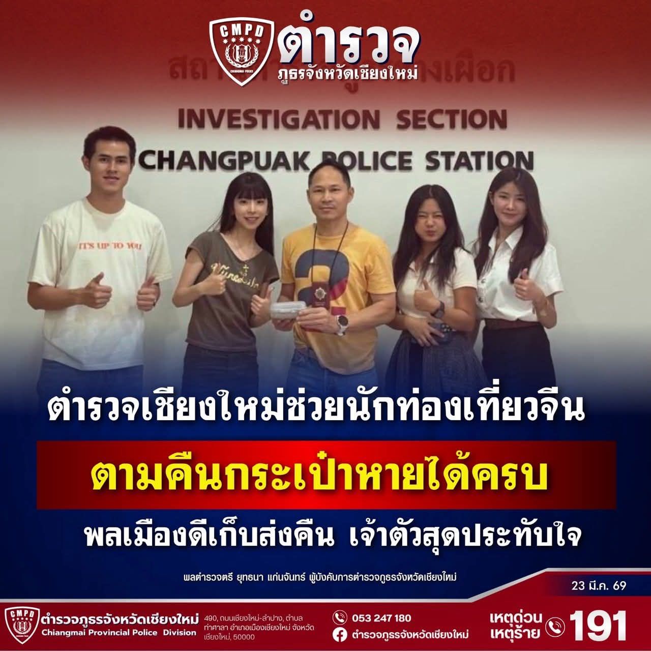 เชียงใหม่ – เมื่อวันที่ 23 มีนาคม 2569 สถานีตำรวจภูธรช้างเผือกสร้างความประทับใจให้แก่นักท่องเที่ยวอีกครั้ง หลังประสบความสำเร็จในการติดตามทรัพย์สินคืนให้แก่ น.ส. JIA ZENG นักท่องเที่ยวชาวจีนที่ทำกระเป๋าหล่นหายในพื้นที่