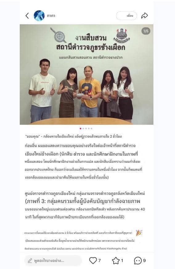 ย้อนกลับไปเมื่อวันที่ 20 มีนาคมที่ผ่านมา น.ส. JIA ZENG ได้ทำกระเป๋าถือสีฟ้าสูญหายบริเวณริมถนนป่าตัน หน้าร้านอาหารแห่งหนึ่ง ภายในมีทรัพย์สินสำคัญทั้งบัตรประจำตัวประชาชน กล้องถ่ายรูป Canon และเครื่องสำอาง ซึ่งหลังจากเกิดเหตุเจ้าหน้าที่ตำรวจได้เร่งดำเนินการตรวจสอบกล้องวงจรปิดทันที