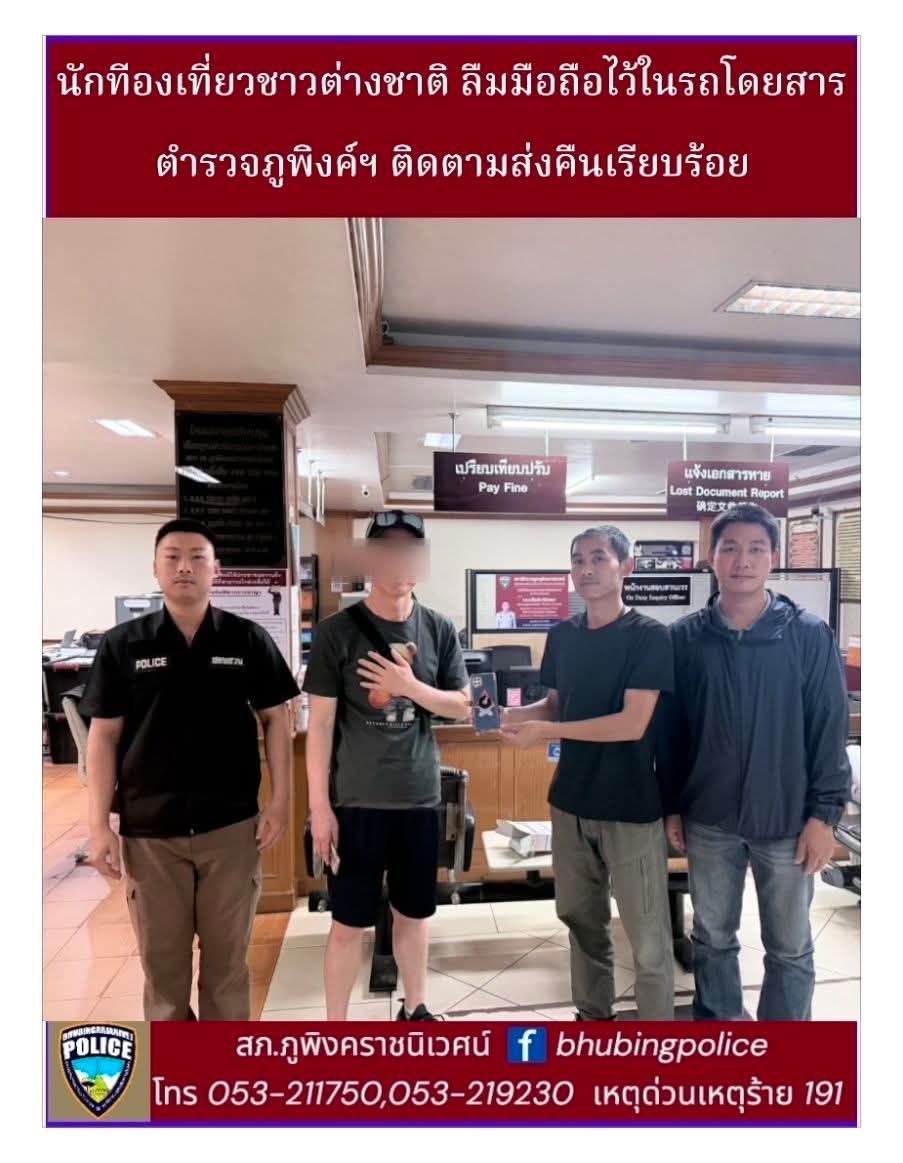 เมื่อวันที่ 25 มีนาคม 2569 สถานีตำรวจภูพิงคราชนิเวศน์ จังหวัดเชียงใหม่ ภายใต้การอำนวยการของ พ.ต.อ.สิโณทัย ลิลิตธรรม ผกก.สภ.ภูพิงคราชนิเวศน์ พร้อมด้วย พ.ต.ท.ณัฐวุฒิ น้อยสอน รอง ผกก.สส. และ พ.ต.ท.นพรัตน์ อุตเสน สว.สส. ได้ร่วมกับชุดสืบสวนเร่งดำเนินการให้ความช่วยเหลือนักท่องเที่ยวชาวเกาหลีใต้รายหนึ่ง ซึ่งเดินทางเข้าแจ้งความด้วยความกังวลใจหลังจากลืมโทรศัพท์มือถือทิ้งไว้บนรถโดยสารผ่านแอปพลิเคชัน (BOLT)