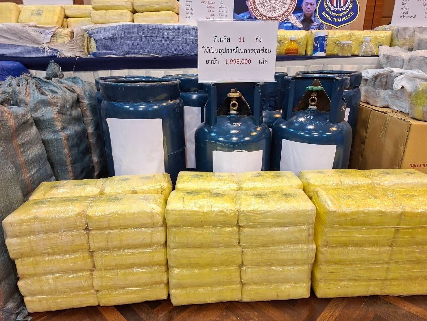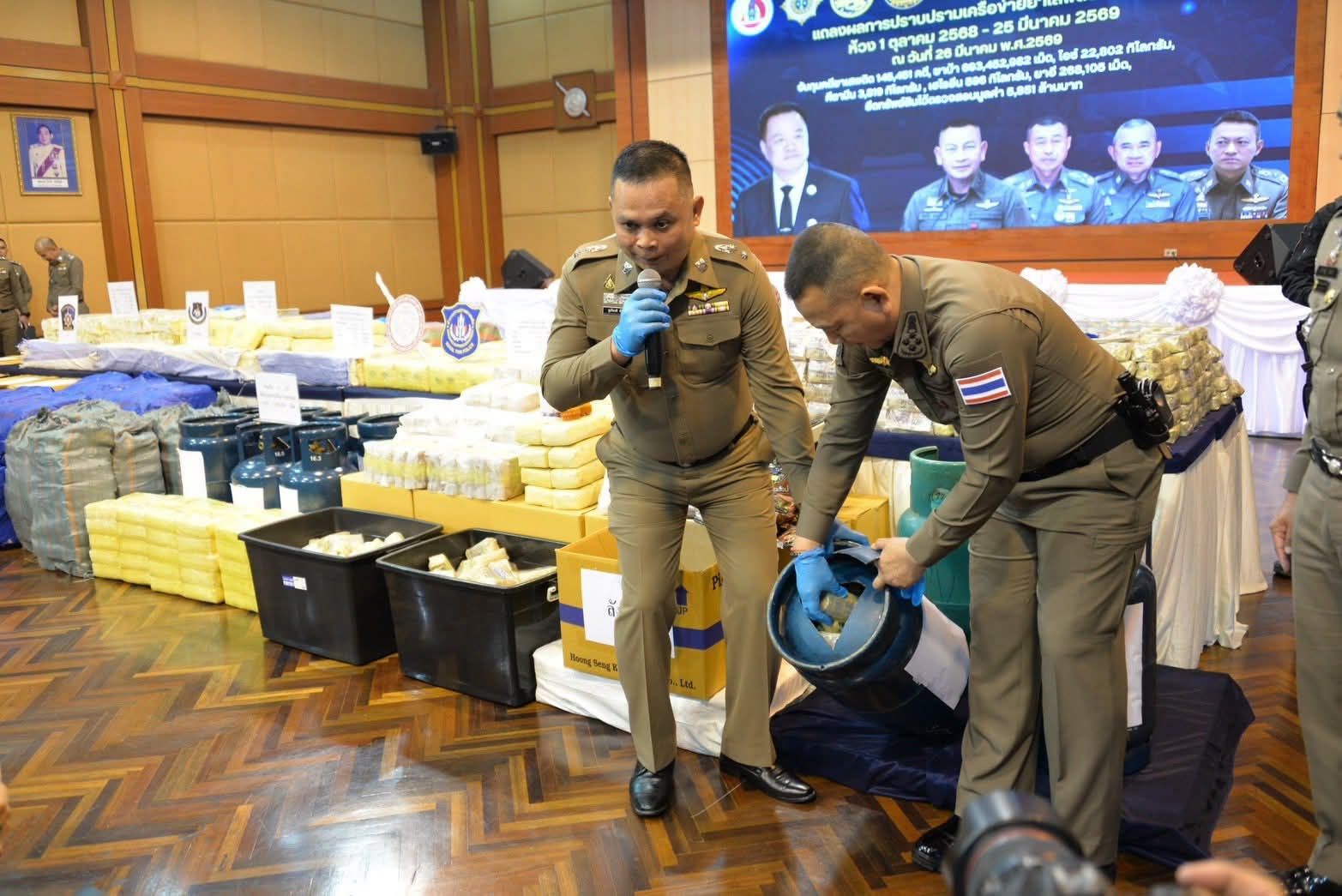 กองบัญชาการตำรวจปราบปรามยาเสพติด (บช.ปส.) มีผลการปฏิบัติระหว่างวันที่ 1 ตุลาคม 2568 – 25 มีนาคม 2569 จับกุมคดีเกี่ยวกับยาเสพติดได้จำนวน 650 คดี พร้อมของกลางยาเสพติด ได้แก่ ยาบ้า 184,112,615 เม็ด, ไอซ์ 6,669.70 กิโลกรัม, คีตามีน 659.38, เฮโรอีน 313.21 กิโลกรัม, ยาอี 106,390 เม็ด และอายัดทรัพย์สินที่เกี่ยวเนื่องกับการกระทำความผิดรวมมูลค่ากว่า 1,707 ล้านบาท มีคดีรายสำคัญที่น่าสนใจ อาทิ บก.สกส. รวบคาปั๊ม! สกัดจับแก๊งขนยาบ้าเกือบ 2 ล้านเม็ด ซุกถังแก๊สตบตา ขนจากเชียงรายจ่อส่งภาคกลาง เมื่อวันที่ 3 มกราคม 2569 เจ้าหน้าที่ บก.สกส., และเจ้าหน้าที่ทหาร ขกท.ศปก.ทบ. ได้ร่วมกันจับกุมผู้ต้องหา จำนวน 6 ราย พร้อมของกลางยาบ้า จำนวน 1,998,000 เม็ด การจับกุมครั้งนี้สืบเนื่องจาก กก.1 บก.สกส. ได้รับข้อมูลจากสายลับว่ามีการใช้รถยนต์ 2 คันเป็นขบวนลำเลียง โดยคันหนึ่งทำหน้าที่นำทาง อีกคันใช้บรรทุกยาเสพติดจากพื้นที่ จ.เชียงราย เพื่อนำส่งให้ลูกค้าในพื้นที่ภาคกลางและปริมณฑล ต่อมาตำรวจได้ทำการติดตามพฤติการณ์ของรถยนต์ 2 คัน กระทั่งสามารถสกัดจับได้บริเวณปั๊มน้ำมันใน อ.โกรกพระ จ.นครสวรรค์ พบผู้ต้องหา 6 ราย พร้อมรถยนต์ของกลาง 2 คัน โดยรถกระบะหมายเลขทะเบียน 2ฒษ 8** กรุงเทพมหานคร พบถังแก๊สบรรทุกอยู่ท้ายกระบะ จำนวน 11 ถัง จากการตรวจสอบเบื้องต้นพบว่าถังแก๊สมีลักษณะคล้ายกับมีรอยเชื่อมน่าเชื่อว่าอาจจะมียาเสพติดซุกซ่อนอยู่ภายในถังแก๊สดังกล่าว จากการนำรถไปตรวจสอบด้วยเครื่องเอกซเรย์ พบยาบ้าซุกซ่อนอยู่ภายในถังแก๊สจำนวนมาก ก่อนทำการผ่าถังออกตรวจนับได้ประมาณ 1,988,000 เม็ด โดยผู้ต้องหาให้การรับสารภาพว่าได้รับจ้างลำเลียงจากชายแดนภาคเหนือเพื่อนำไปส่งให้เครือข่ายในพื้นที่ภาคกลาง เบื้องต้นเจ้าหน้าที่ได้ควบคุมตัวผู้ต้องหาทั้งหมดพร้อมของกลาง ส่งดำเนินคดีตามกฎหมาย และอยู่ระหว่างขยายผลไปยังผู้ร่วมขบวนการรายอื่นต่อไป