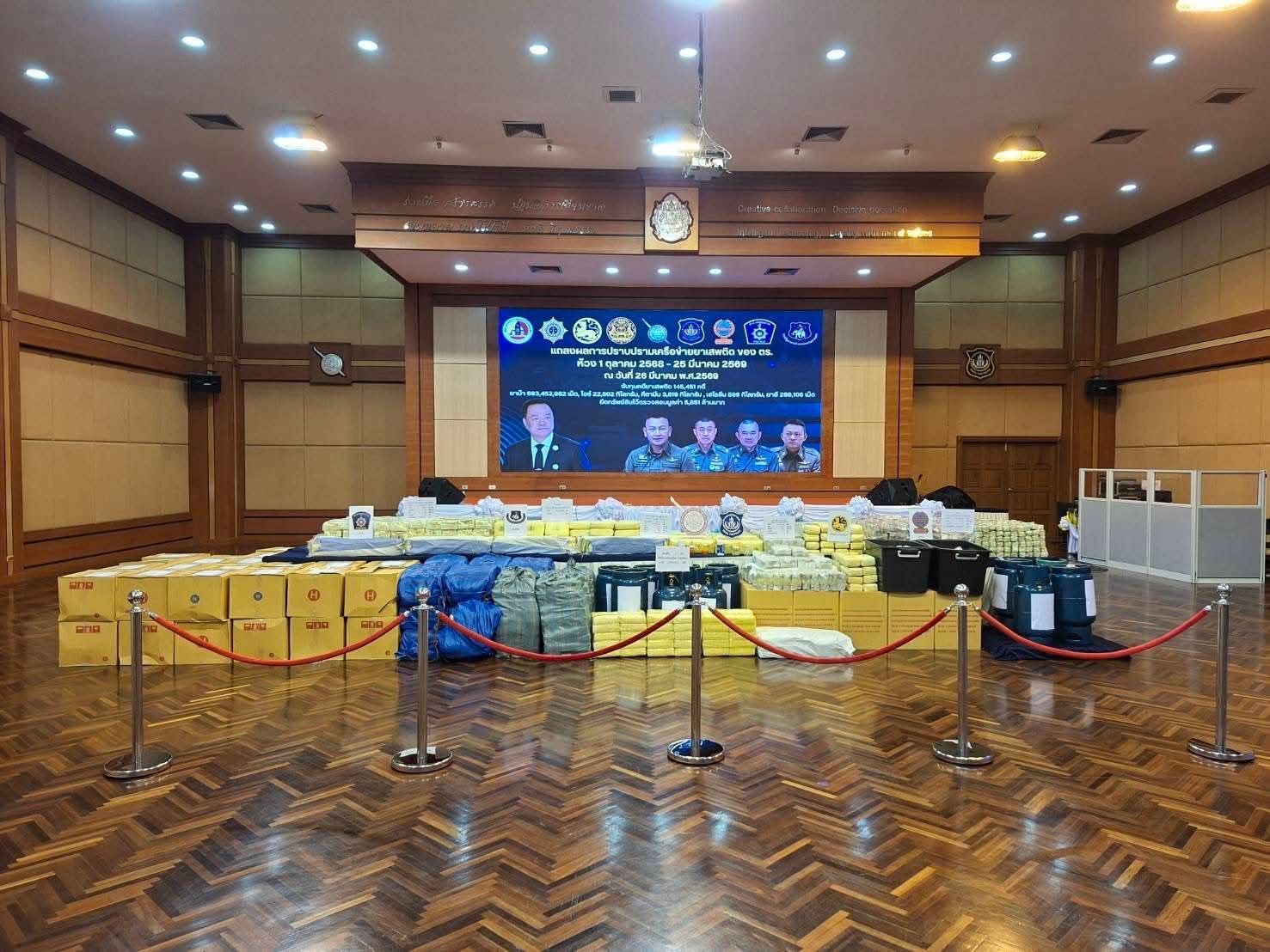 สำนักงานตำรวจแห่งชาติได้ดำเนินการบูรณาการกำลังร่วมกับหน่วยงานที่เกี่ยวข้องอย่างเข้มข้น ระหว่างวันที่ 1 ตุลาคม 2568 – 25 มีนาคม 2569 เพื่อขับเคลื่อนมาตรการปราบปรามยาเสพติดในทุกมิติ ส่งผลให้สามารถจับกุมคดีเกี่ยวกับยาเสพติดได้จำนวน 145,541 คดี พร้อมทั้งตรวจยึดของกลางจำนวนมาก ได้แก่ ยาบ้า 693,452,982 เม็ด, ไอซ์ 22,802.39 กิโลกรัม, เฮโรอีน 596.92 กิโลกรัม, คีตามีน 3,819.07 กิโลกรัม, ยาอี 268,105 เม็ด, และอายัดทรัพย์สินที่เกี่ยวเนื่องกับการกระทำความผิดรวมมูลค่ากว่า 5,851 ล้านบาท