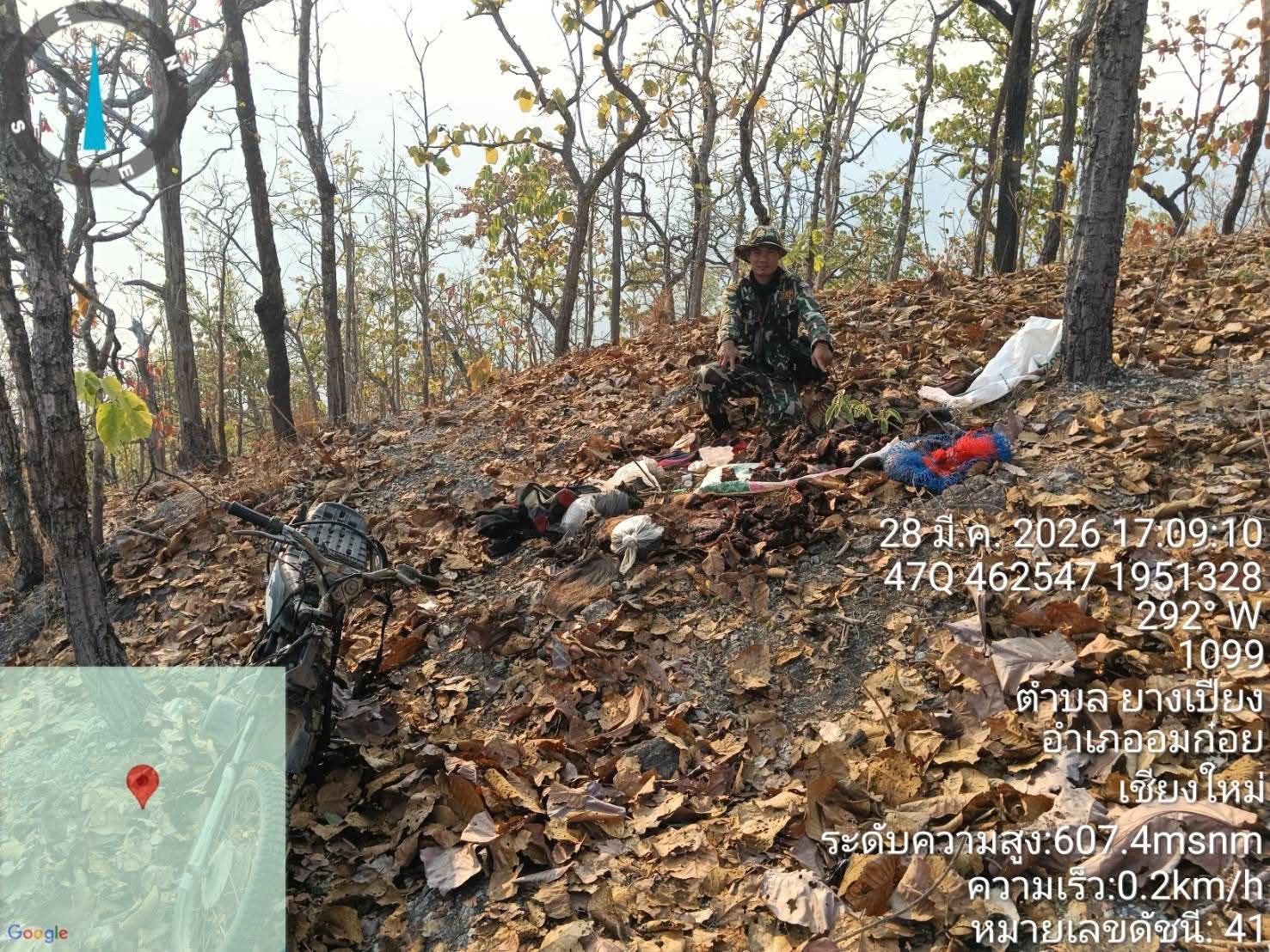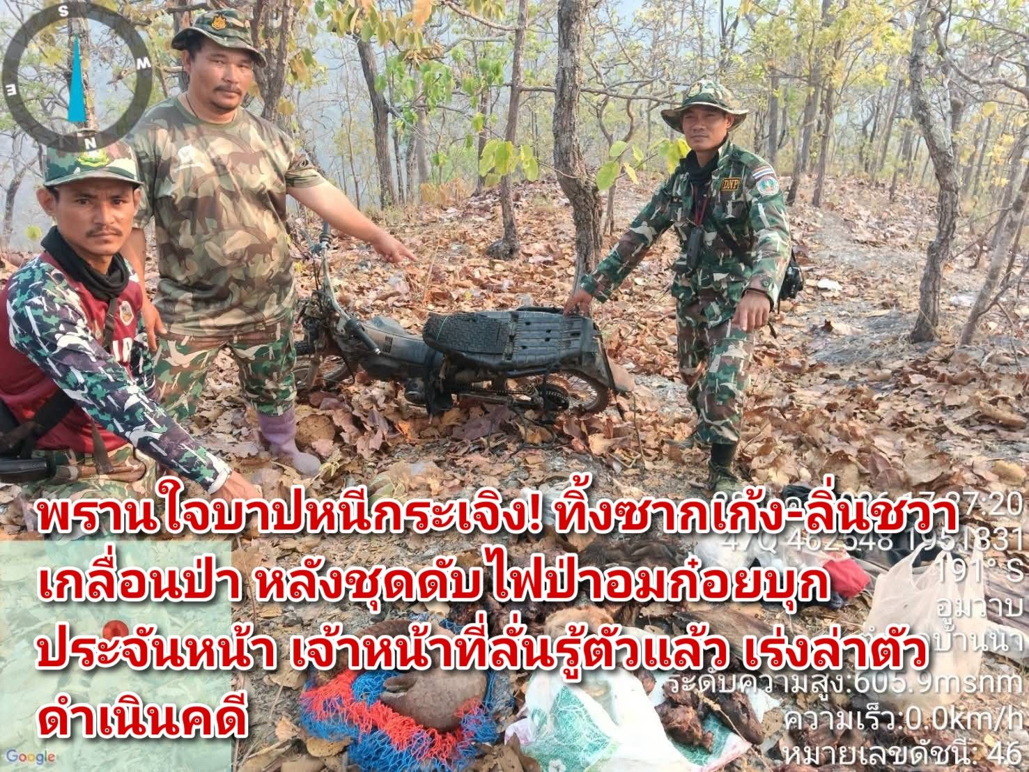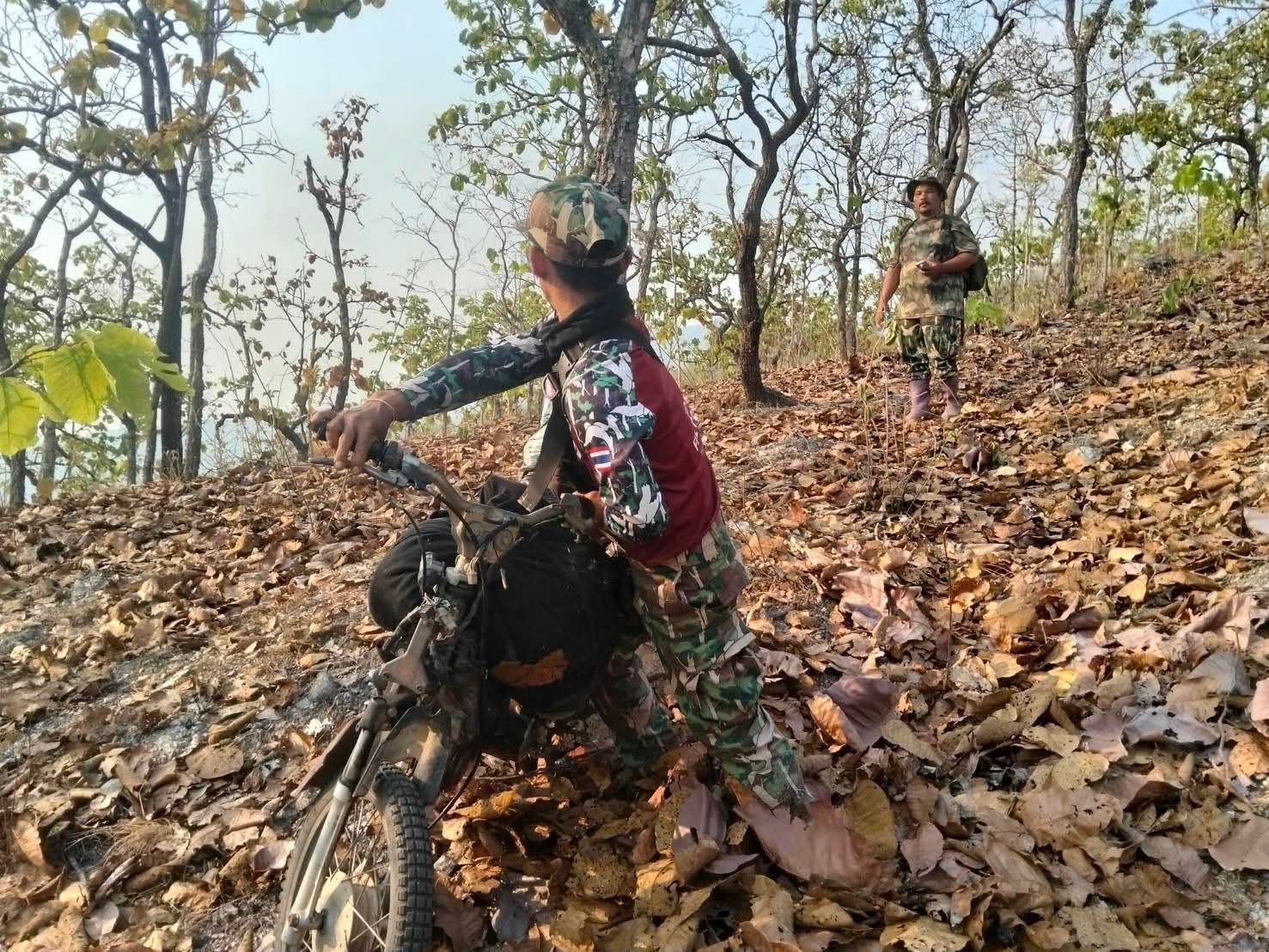 ในระหว่างที่เจ้าหน้าที่กำลังระดมกำลังเข้าดับไฟป่าในจุดเป้าหมายอยู่นั้น ได้พบชายต้องสงสัย 2 ราย โดยรายแรกกำลังขับขี่รถจักรยานยนต์พร้อมสะพายอาวุธปืนลูกซอง และมีกระสอบต้องสงสัยมัดติดรถมาด้วยทั้งด้านหน้าและด้านหลัง ส่วนชายรายที่สองกำลังเดินตามหลังมา เมื่อเจ้าหน้าที่แสดงตัวเพื่อขอเข้าตรวจสอบ ชายทั้งสองคนเกิดไหวตัวทันและได้ทิ้งรถจักรยานยนต์รวมถึงสัมภาระทั้งหมด ก่อนจะวิ่งหนีหายไปในความมืดอย่างรวดเร็ว