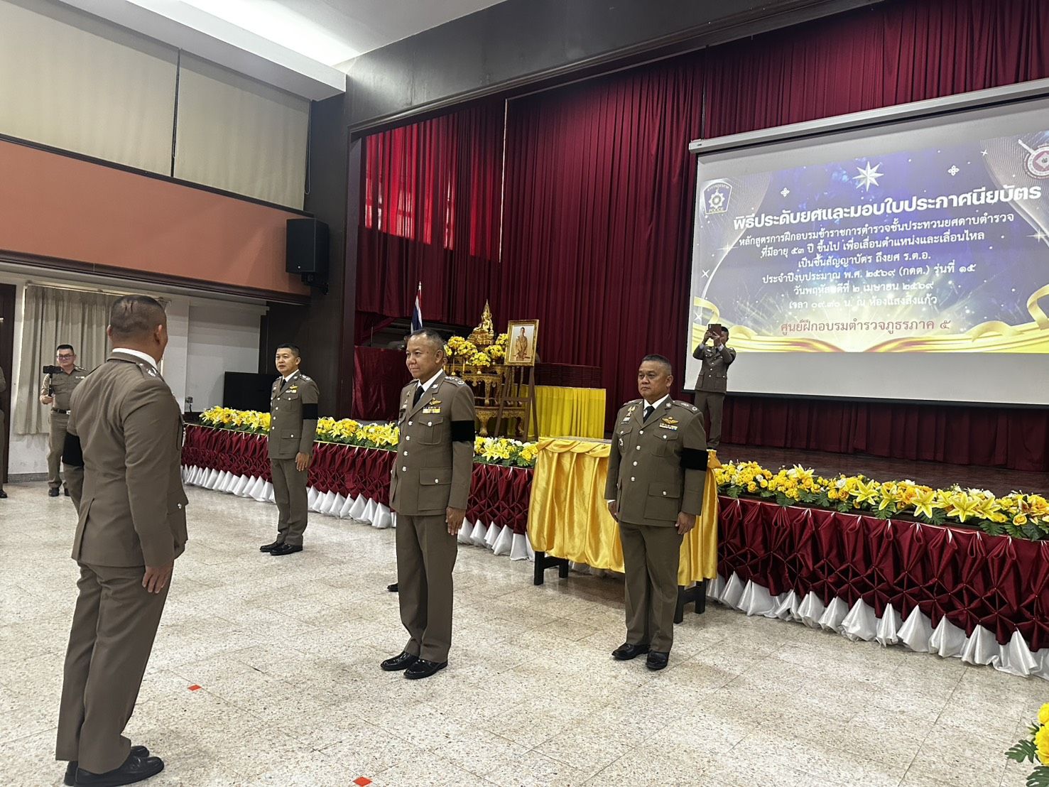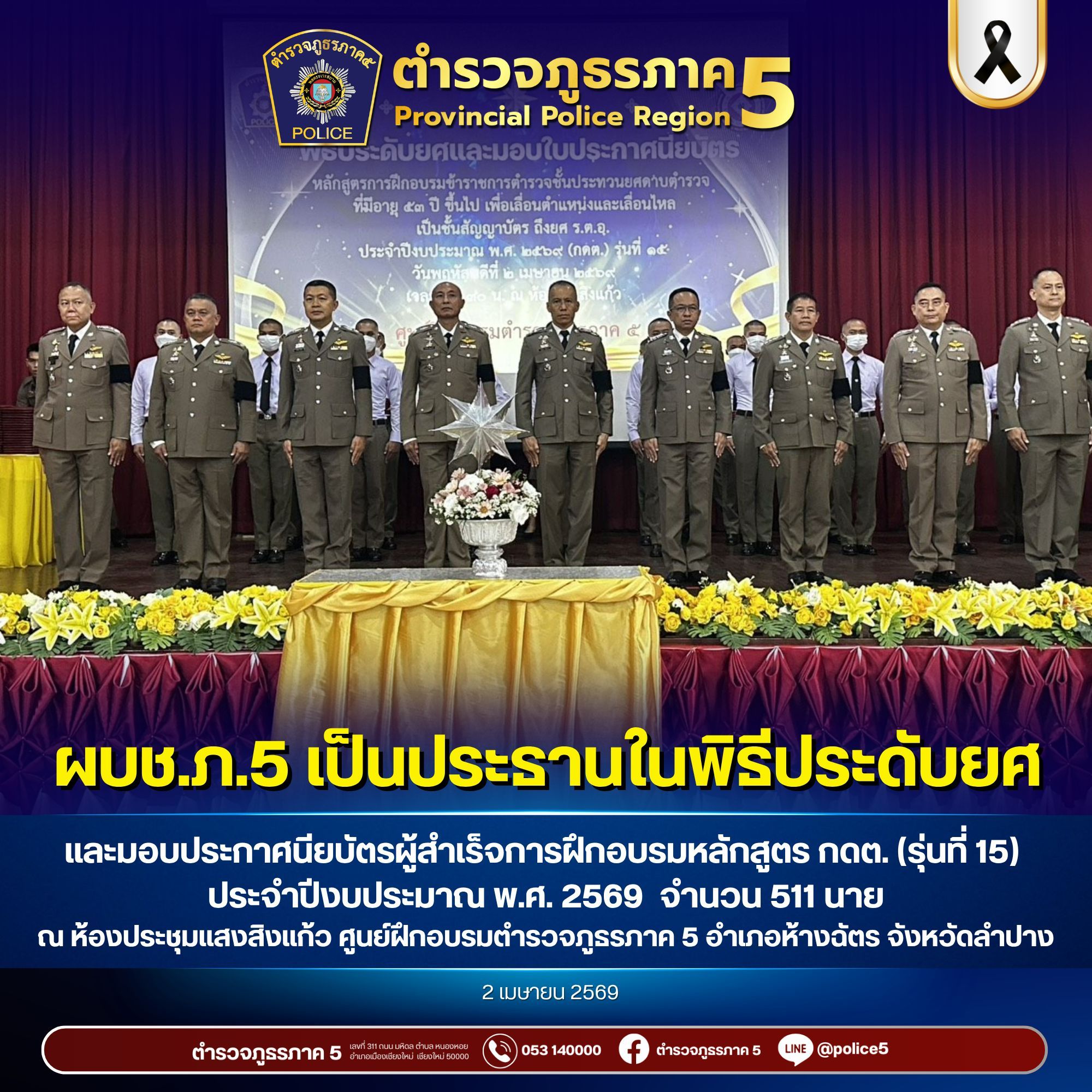 พล.ต.ท.กฤตธาพล ยี่สาคร ผบช.ภ.5 เป็นประธานในพิธีประดับยศและมอบประกาศนียบัตรผู้สำเร็จการฝึกอบรมข้าราชการตำรวจชั้นประทวนยศดาบตำรวจที่มีอายุ 53 ปีขึ้นไปเพื่อเลื่อนตำแหน่งและเลื่อนยศแบบเลื่อนไหลเป็นชั้นสัญญาบัตรถึงยศร้อยตำรวจเอก ประจำปีงบประมาณ พ.ศ. 2569 (รุ่นที่ 15) โดยมีจำนวนข้าราชการตำรวจเข้ารับประดับยศและรับมอบประกาศนียบัตรผู้สำเร็จการฝึกอบรมรวมทั้งสิ้น จำนวน 511 นาย แยกเป็นข้าราชการตำรวจในสังกัด ภ.5 จำนวน 468 นาย, บช.ก.จำนวน 13 นาย, บช.ปส. จำนวน 6 นาย, สตม. จำนวน 20 นาย และ บช.ทท. จำนวน 4 นาย