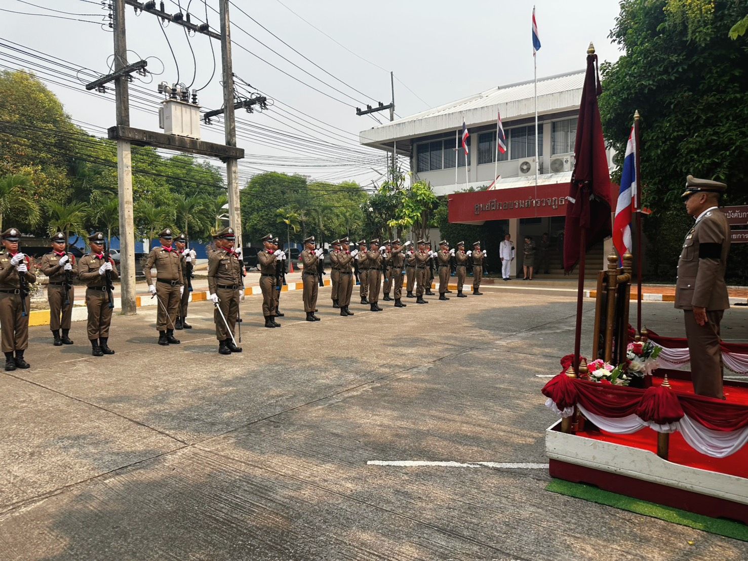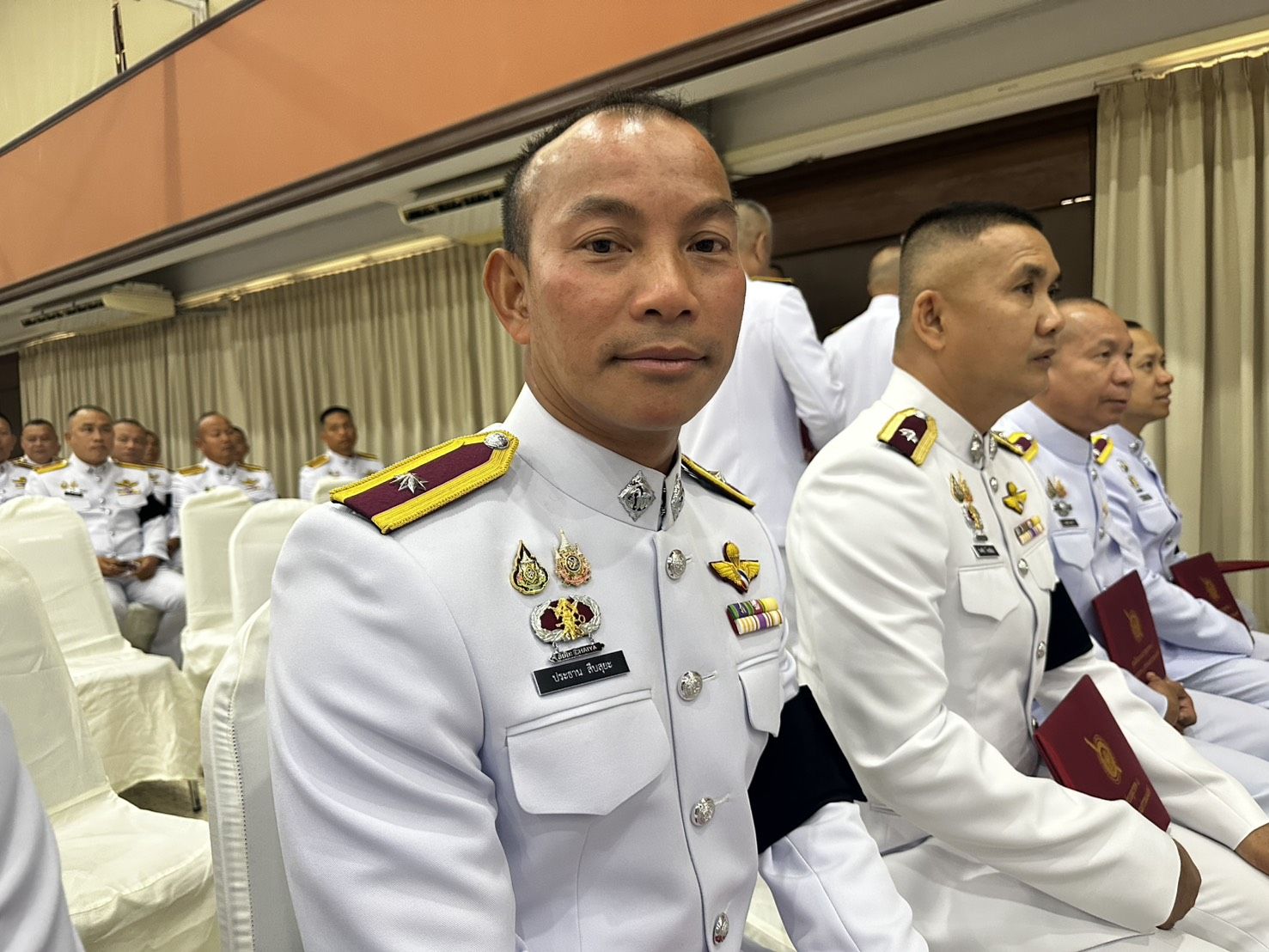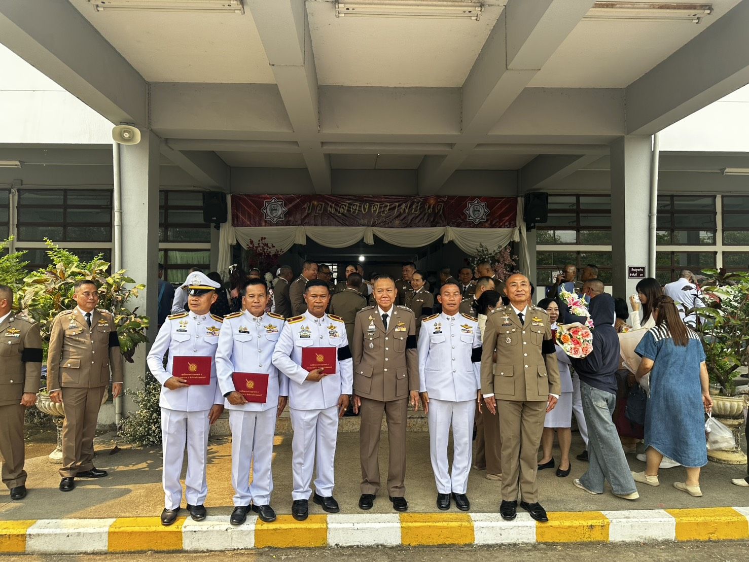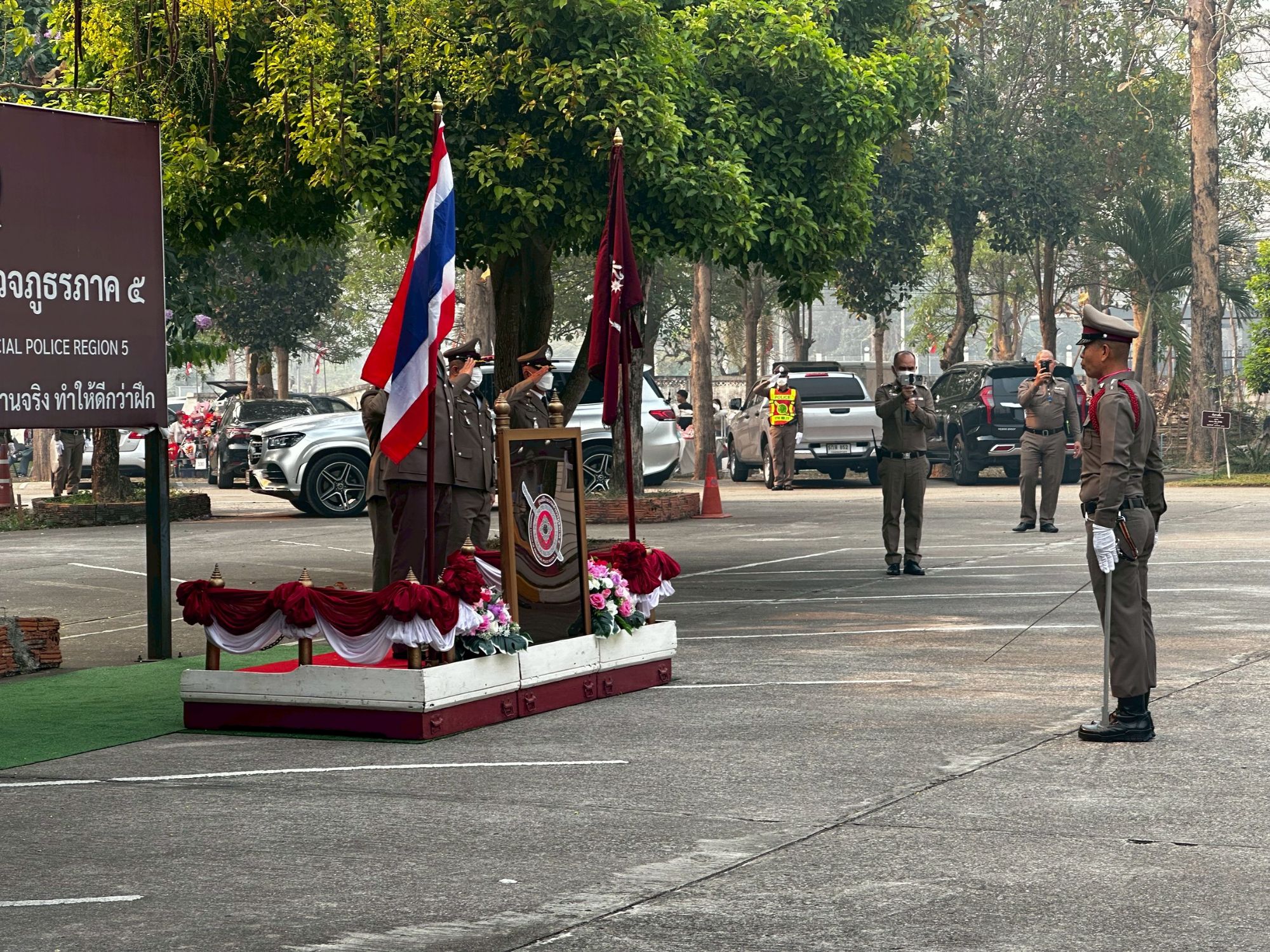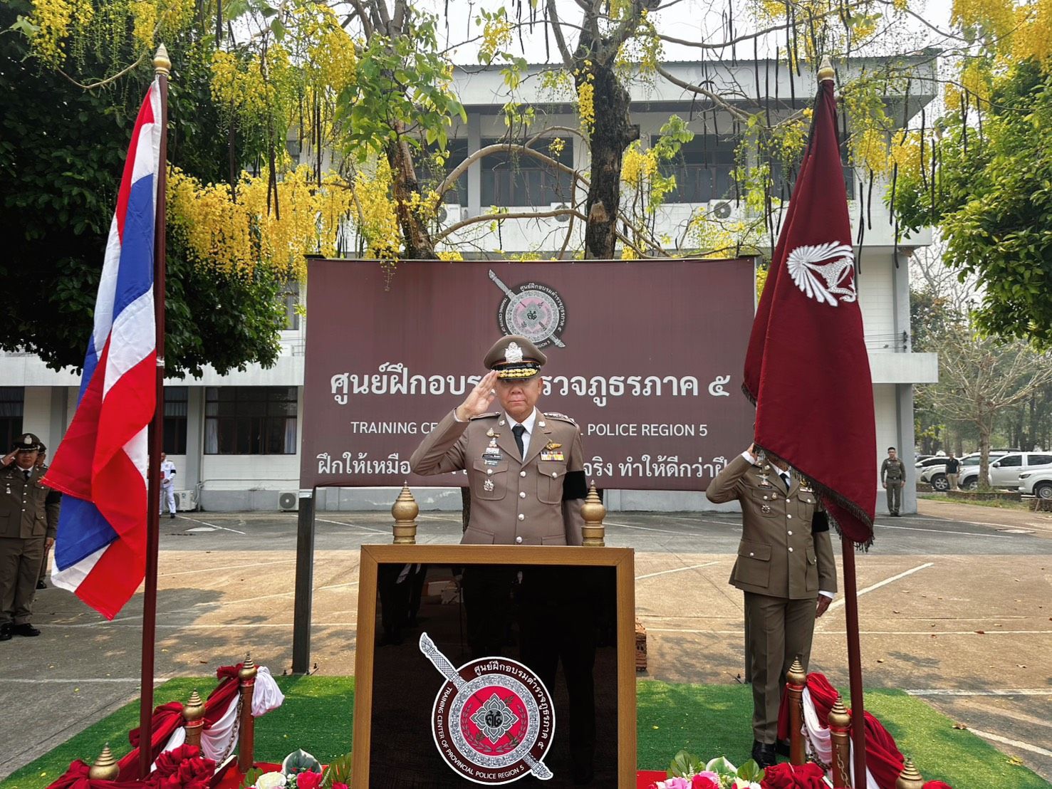 ประจัญ ปัญญาแก้ว ผบก.ศฝร.ภ.5, พ.ต.อ.สมพงษ์ บุญมาประเสริฐ รอง ผบก.ภ.จว.ลำปาง, พ.ต.อ.พรเทพ น้องการ รอง ผบก.ภ.จว.พะเยา, พ.ต.อ. วชิระ กาญจนวิภาดา รอง ผบก.ภ.จว.ลำพูน, พ.ต.อ.ชลทฤษ ชัชวาลย์ รอง ผบก.ภ.จว.เชียงราย, พ.ต.อ.นฤบาล จิตทยานันท์ รอง ผบก.ภ.จว.เชียงใหม่, พ.ต.อ.ยุทธนา ยะนันโต รอง ผบก.ภ.จว. แม่ฮ่องสอน, พ.ต.อ.ศุภธรโชติ จำหงษ์ รอง ผบก.ภ.จว.น่าน เข้าร่วมพิธี ณ ห้องประชุมแสงสิงแก้ว ศูนย์ฝึกอบรมตำรวจภูธรภาค 5 อำเภอห้างฉัตร จังหวัดลำปาง.