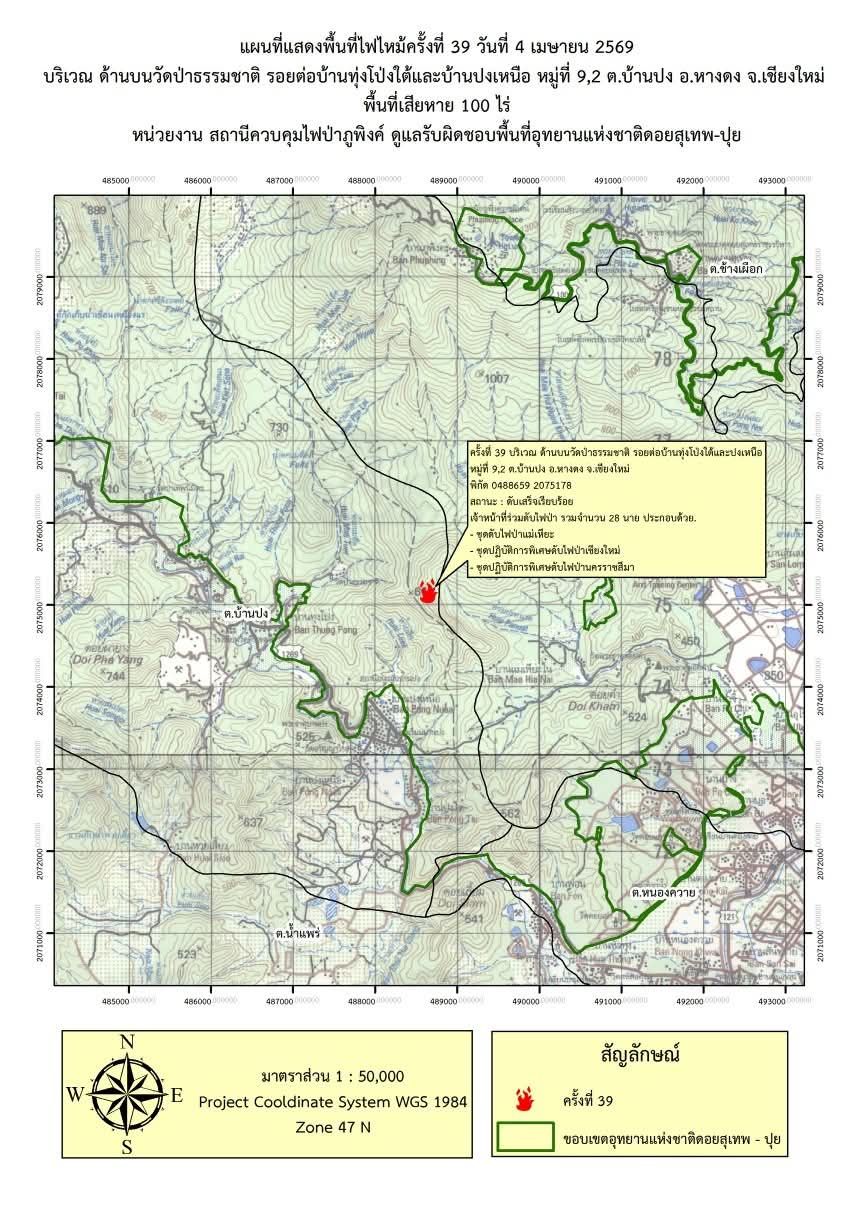 เหตุการณ์ดังกล่าวเกิดขึ้นเมื่อเวลาประมาณ 16.27 น. ของวันที่ 4 เมษายน 2569 ที่ผ่านมา เมื่อเจ้าหน้าที่จุดตรวจเฝ้าระวังไฟผาดำได้ตรวจพบกลุ่มควันและเปลวไฟบริเวณป่าเหนือวัดป่าธรรมชาติ ซึ่งเป็นเขตรอยต่อระหว่างหมู่ 9 และหมู่ 2 ตำบลบ้านปง อำเภอหางดง จังหวัดเชียงใหม่ หลังรับแจ้งเหตุได้มีการบูรณาการกำลังร่วมกันอย่างเร่งด่วนถึง 28 นาย ประกอบด้วย เจ้าหน้าที่สถานีควบคุมไฟป่าภูพิงค์, เจ้าหน้าที่อุทยานแห่งชาติดอยสุเทพ-ปุย, ชุดปฏิบัติการพิเศษดับไฟป่า (Base Camp) เชียงใหม่ และกำลังเสริมจากชุดปฏิบัติการพิเศษดับไฟป่านครราชสีมา