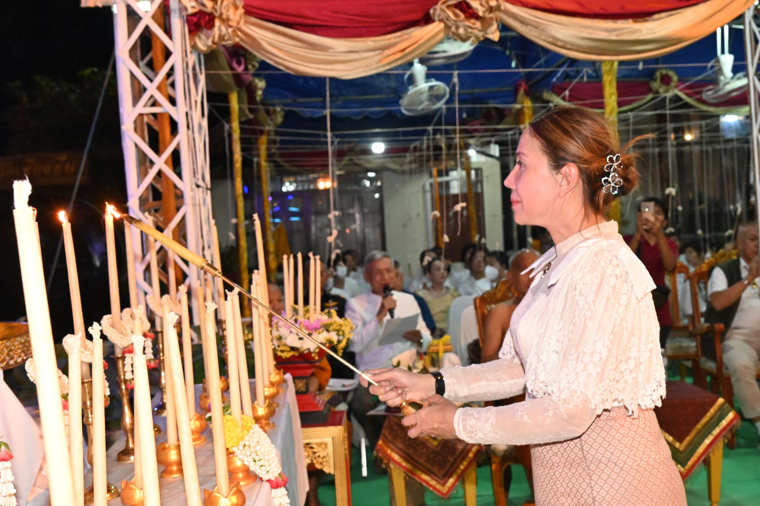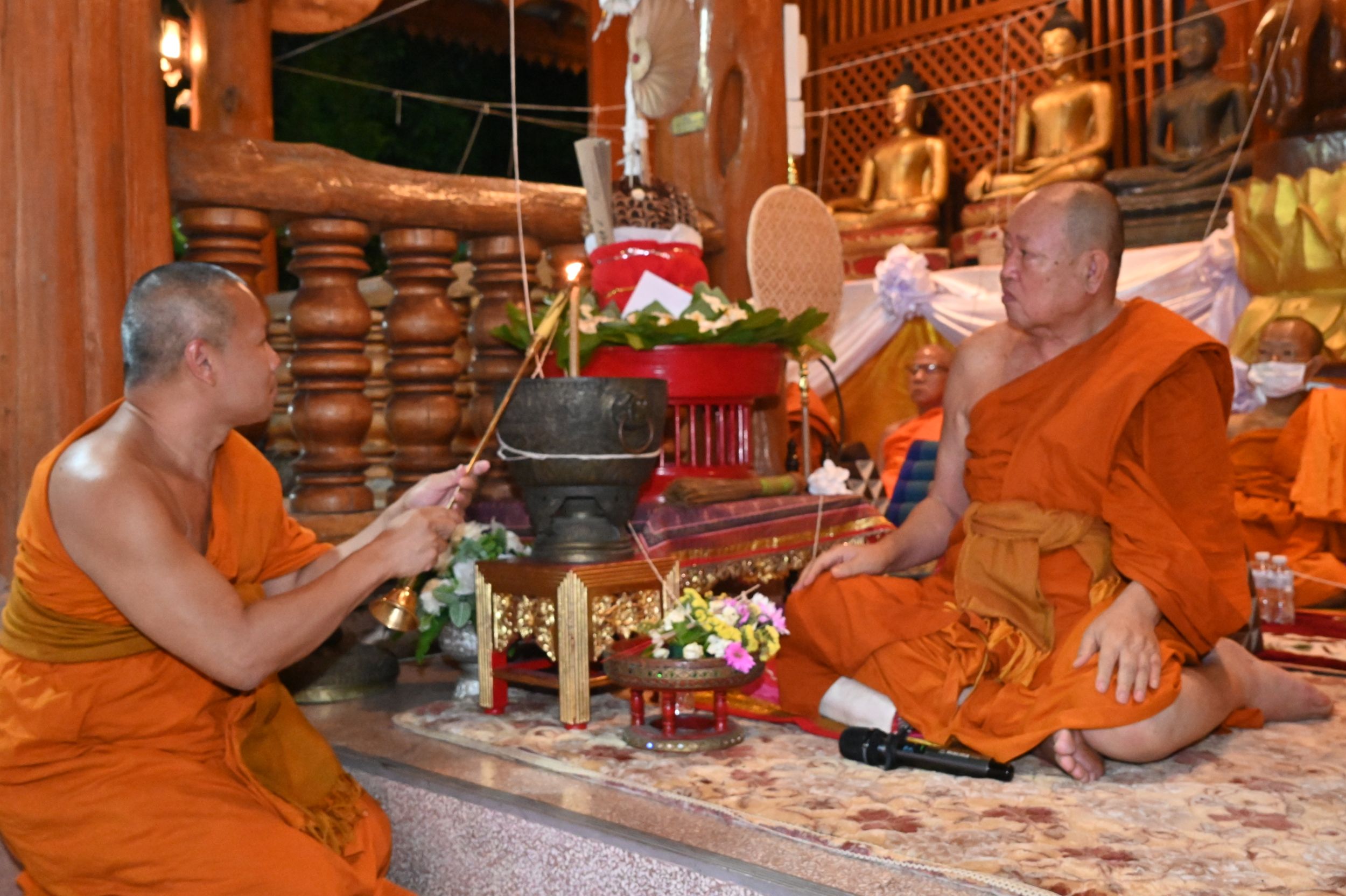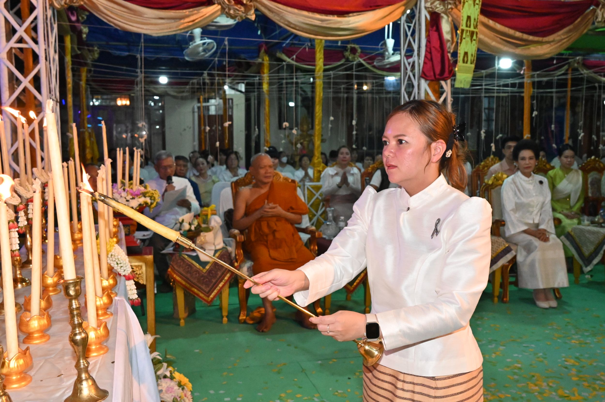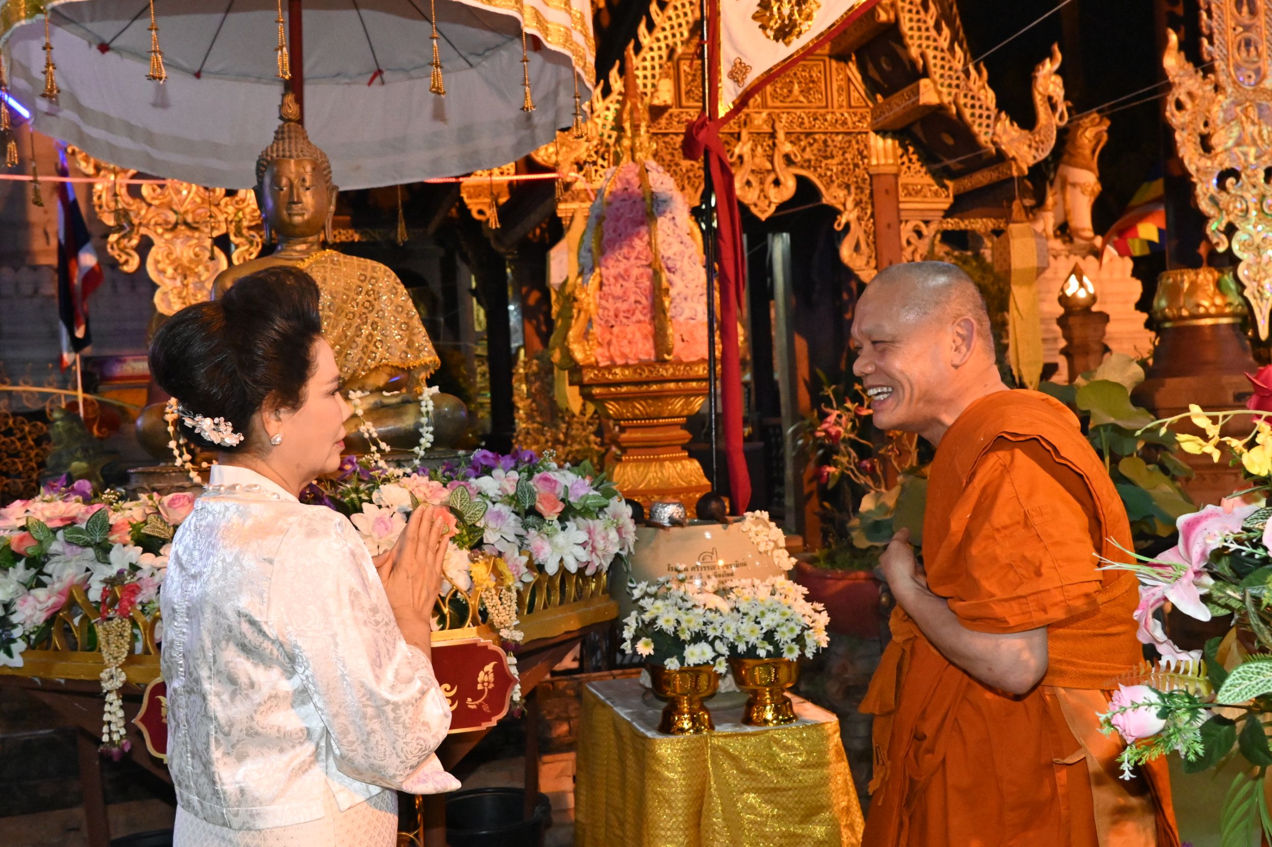 ขณะเดียวกัน ได้รับเกียรติจากเจ้าภาคินัย ณ เชียงใหม่ และเจ้าเจือจันทร์ ณ เชียงใหม่ ร่วมเป็นประธานฝ่ายฆราวาส จุดเทียนชัยและร่วมประกอบพิธีอย่างพร้อมเพรียง ท่ามกลางบรรยากาศแห่งความเลื่อมใสศรัทธาของพุทธศาสนิกชนที่เข้าร่วมพิธีเป็นจำนวนมาก