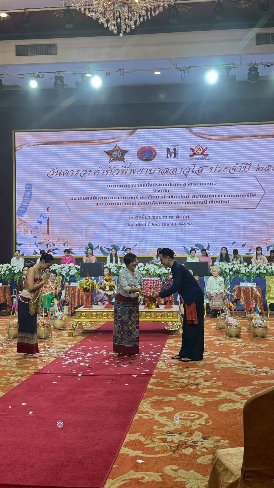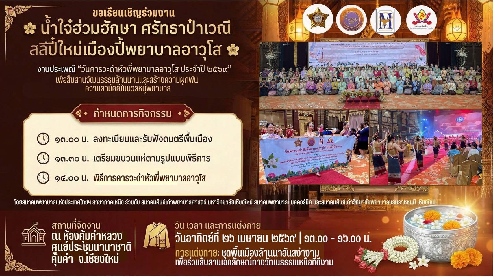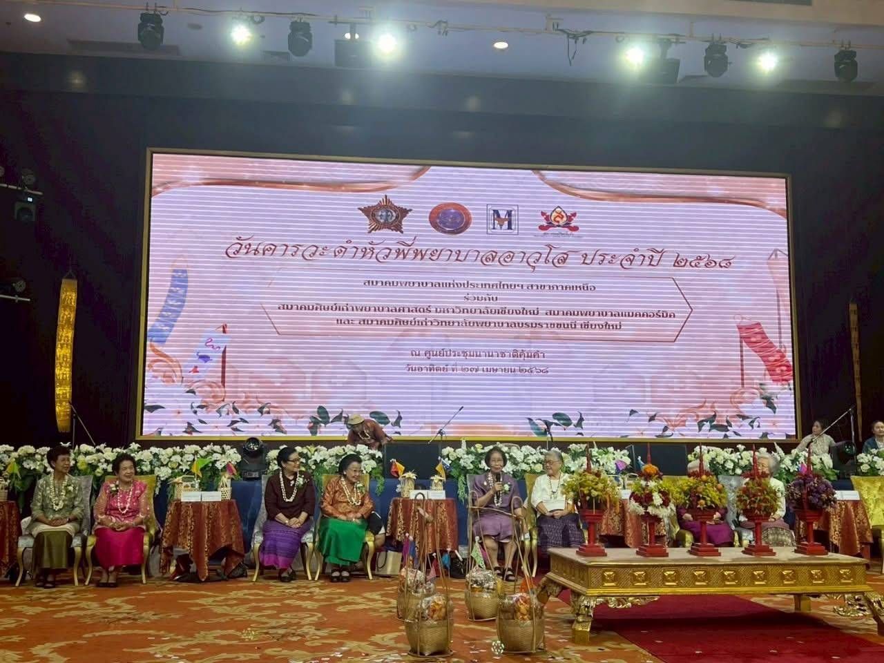 สมาคมพยาบาลแห่งประเทศไทยฯ สาขาภาคเหนือ ร่วมกับสมาคมศิษย์เก่าพยาบาลศาสตร์ มหาวิทยาลัยเชียงใหม่ สมาคมพยาบาลแมคคอร์มิค และสมาคมศิษย์เก่าวิทยาลัยพยาบาลบรมราชชนนี เชียงใหม่ ขอเชิญชวนพี่น้องพยาบาลทั่วทั้งภาคเหนือ นักศึกษาพยาบาล และแขกผู้มีเกียรติทุกท่าน ร่วมสืบสานประเพณีอันดีงามและแสดงมุทิตาจิตในงาน “น้ำใจ๋ฮ่วมฮักษา ศรัทธาป๋าเวณี สลีปี๋ใหม่เมืองพี่พยาบาลอาวุโส” ซึ่งจัดขึ้นเพื่อเป็นการเชิดชูเกียรติและแสดงความกตัญญูกตเวทีต่อพยาบาลอาวุโสผู้เป็นต้นแบบแห่งวิชาชีพ