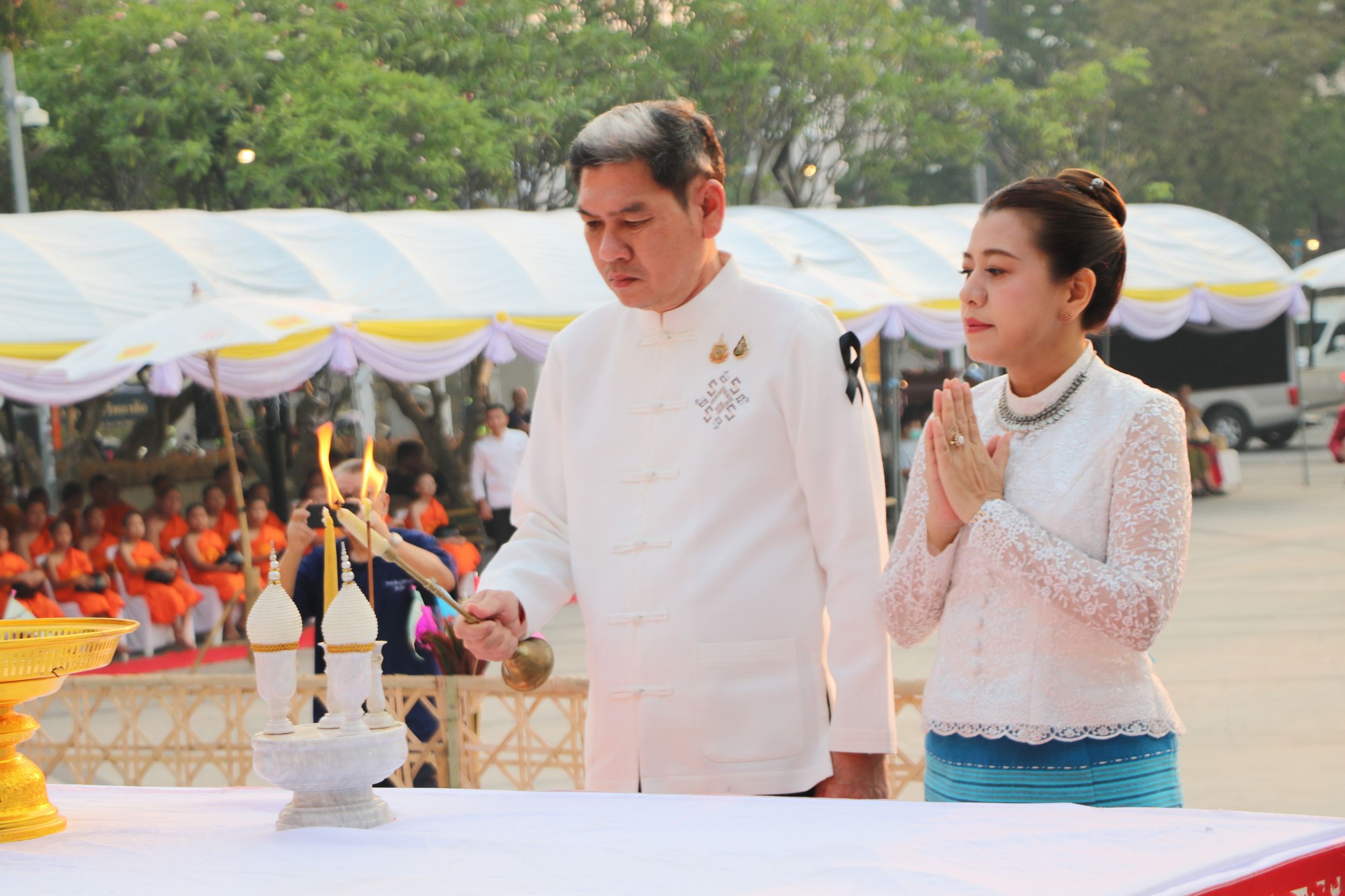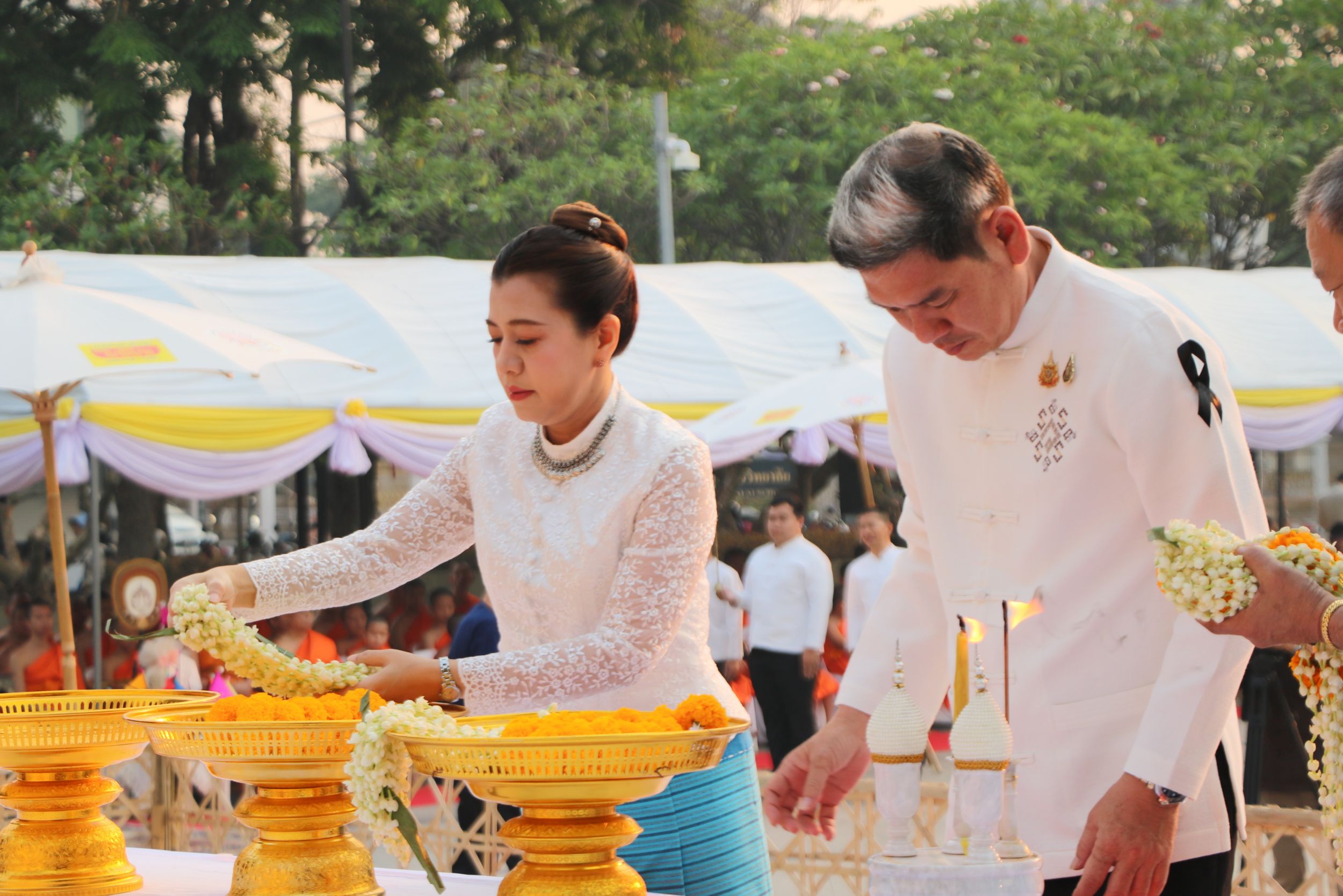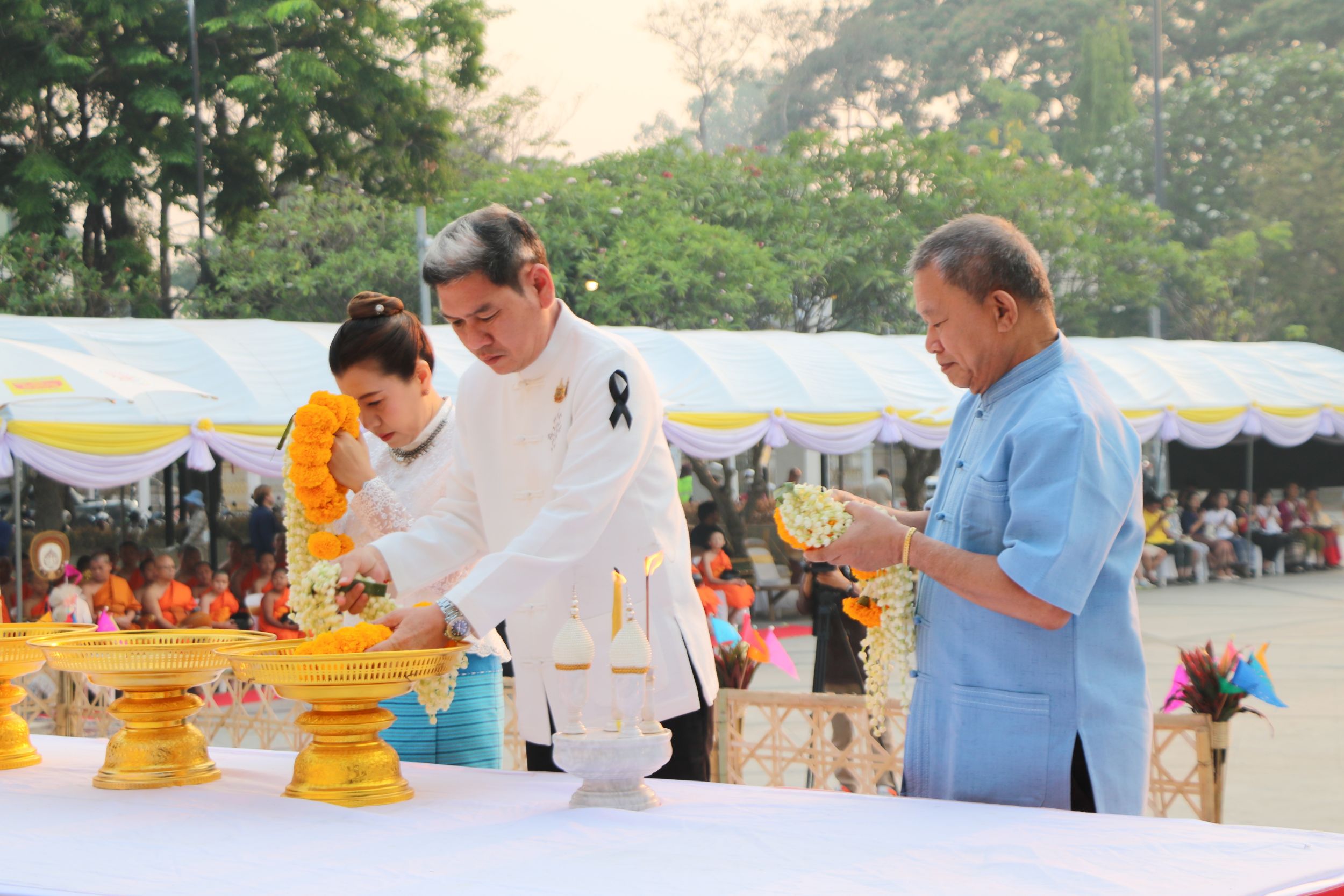 ในส่วนของฝ่ายฆราวาส ได้รับเกียรติจาก รัฐพล นราดิศร ผู้ว่าราชการจังหวัดเชียงใหม่ เป็นประธานในพิธี นำจุดธูปเทียนบูชาพระรัตนตรัย และประกอบพิธีถวายขันขอศีลต่อประธานสงฆ์ พร้อมถวายพวงมาลัยจำนวน ๓ ชุด และจุดเครื่องทองน้อยเบื้องหน้าพระบรมราชานุสาวรีย์สามกษัตริย์ เพื่อแสดงความสักการะและรำลึกถึงพระมหากรุณาธิคุณแห่งบูรพกษัตริย์ผู้ทรงสถาปนาเมืองเชียงใหม่