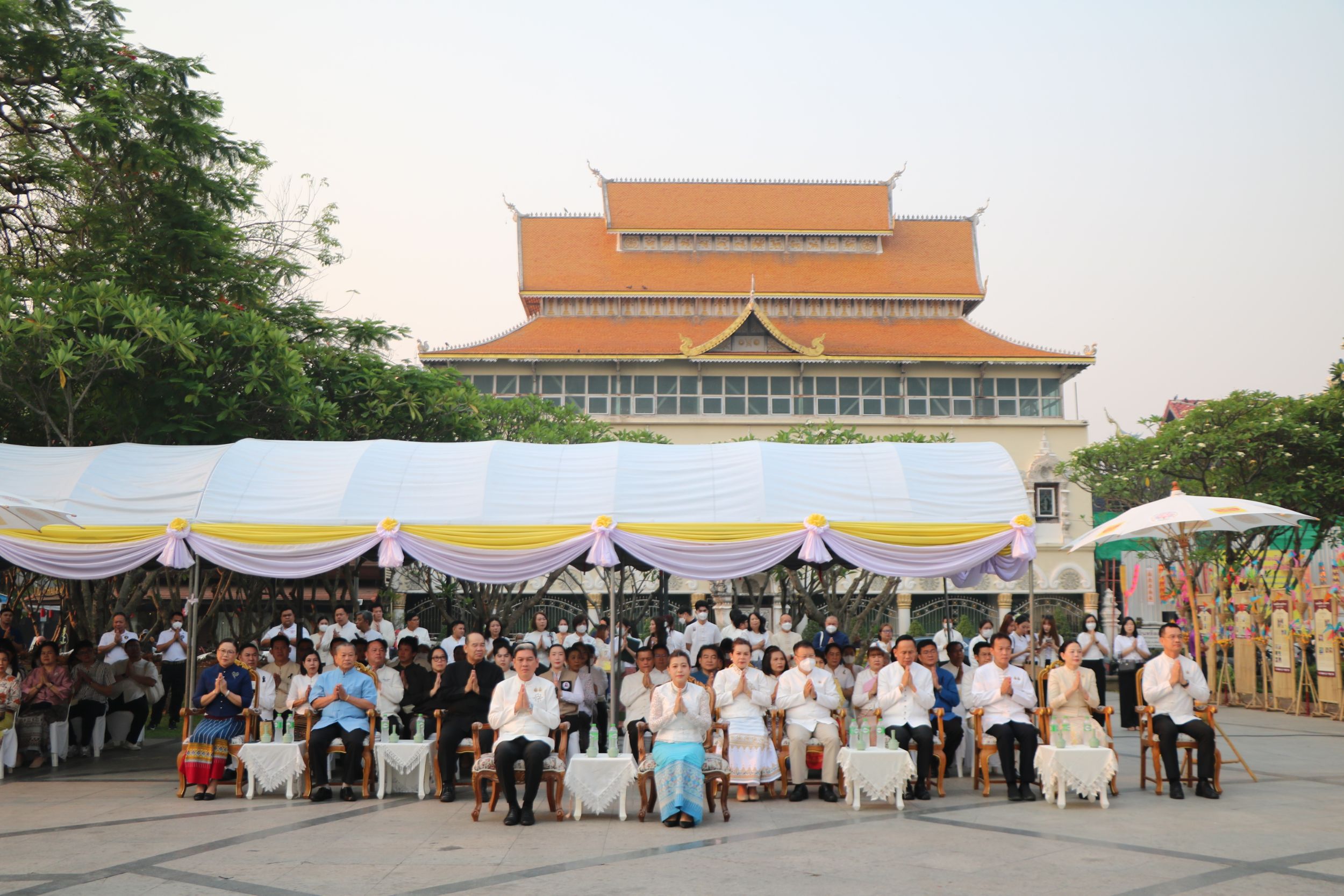 ในส่วนของฝ่ายฆราวาส ได้รับเกียรติจาก รัฐพล นราดิศร ผู้ว่าราชการจังหวัดเชียงใหม่ เป็นประธานในพิธี นำจุดธูปเทียนบูชาพระรัตนตรัย และประกอบพิธีถวายขันขอศีลต่อประธานสงฆ์ พร้อมถวายพวงมาลัยจำนวน ๓ ชุด และจุดเครื่องทองน้อยเบื้องหน้าพระบรมราชานุสาวรีย์สามกษัตริย์ เพื่อแสดงความสักการะและรำลึกถึงพระมหากรุณาธิคุณแห่งบูรพกษัตริย์ผู้ทรงสถาปนาเมืองเชียงใหม่
