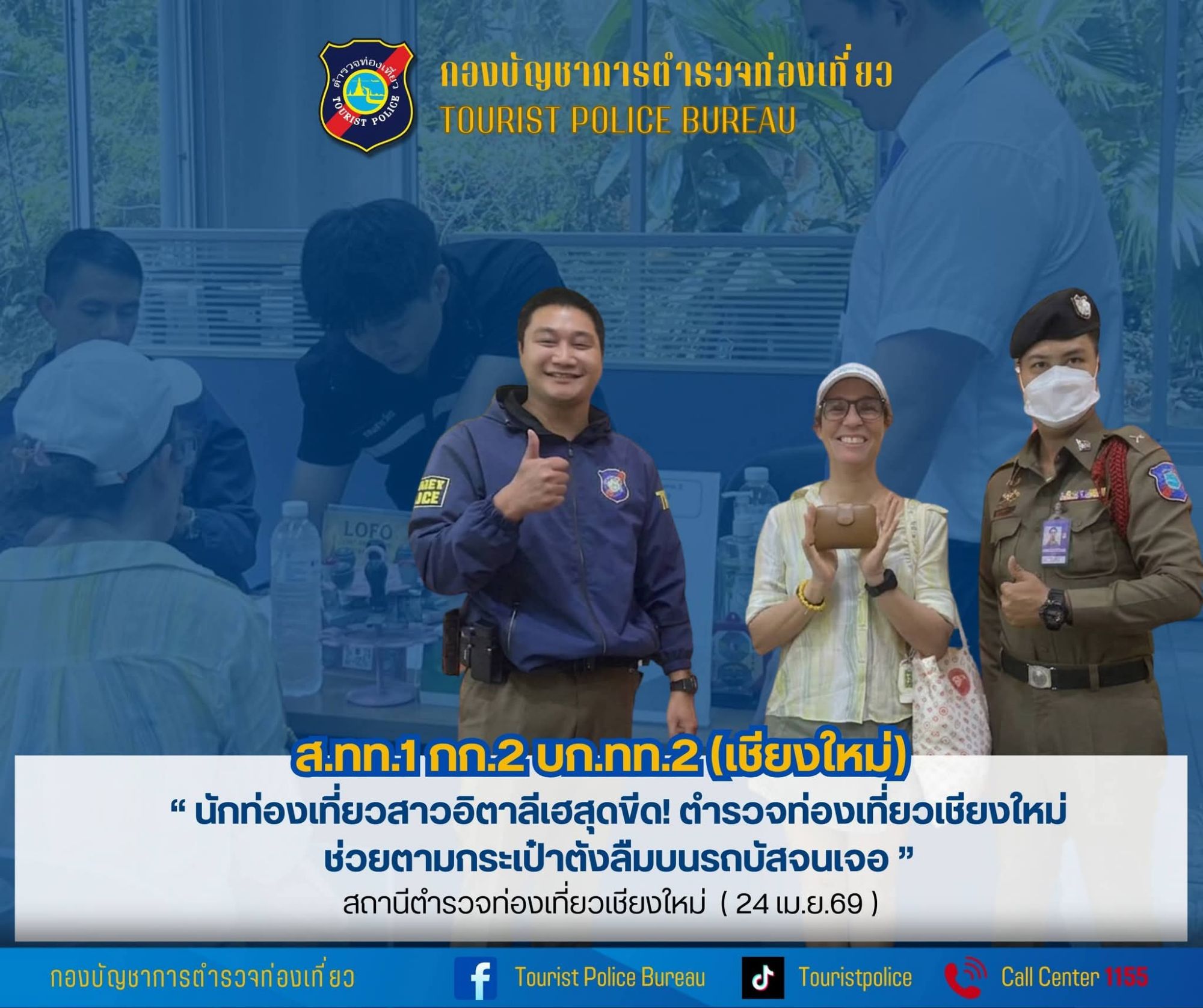 เมื่อบ่ายวันนี้ (24 เมษายน 2569) เวลาประมาณ 14.48 น. ขณะที่บรรยากาศการท่องเที่ยวทางภาคเหนือกำลังคึกคัก เจ้าหน้าที่ตำรวจท่องเที่ยวประจำท่าอากาศยานเชียงใหม่ได้รับแจ้งเหตุขอความช่วยเหลือจากนักท่องเที่ยวสาวชาวอิตาลีรายหนึ่ง ซึ่งอยู่ในอาการตระหนกหลังจากรู้ตัวว่าเผลอทำกระเป๋าเงินที่มีทรัพย์สินและเอกสารสำคัญหลายรายการหล่นหายบนรถบัสโดยสาร