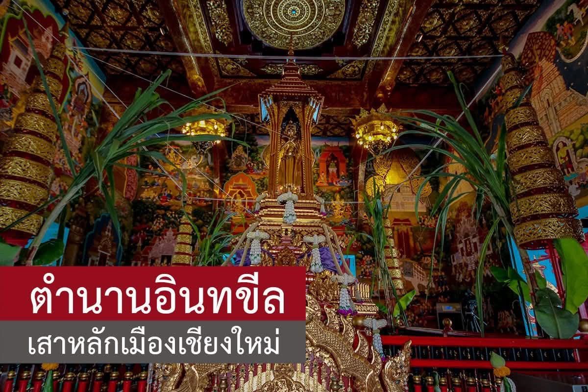 ตามตำนานเล่าขานถึงจุดเริ่มต้นของเสาอินทขีลว่า ในอดีตบริเวณพื้นที่เมืองเชียงใหม่ซึ่งเป็นศูนย์กลางอาณาจักรล้านนาเคยเป็นที่ตั้งของชุมชนชาวลัวะที่ประสบปัญหาผีหลอกหลอนจนเดือดร้อนไม่เป็นอันทำมาหากิน พระอินทร์จึงทรงเมตตาประทานความช่วยเหลือโดยเนรมิตบ่อเงิน บ่อทอง และบ่อแก้วไว้ให้ชาวลัวะ 9 ตระกูลช่วยกันดูแลรักษาและถือศีลอย่างเคร่งครัด ทำให้บ้านเมืองมีความอุดมสมบูรณ์และเป็นสุข แต่เมื่อข่าวความมั่งคั่งเลื่องลือไปไกลจนเกิดความขัดแย้งกับเมืองอื่น ชาวลัวะจึงกราบทูลขอความช่วยเหลือจากพระอินทร์ ซึ่งพระองค์ได้ส่งพญายักขราชและพญาอมรเทพนำเสาอินทขีลหรือเสาตะปูพระอินทร์มาฝังไว้กลางเวียงนพบุรีเพื่อปกป้องคุ้มครอง แต่เมื่อเวลาผ่านไปเกิดกิเลสและความละโมบในหมู่ผู้คน ยักษ์ทั้งสองจึงนำเสาอินทขีลกลับขึ้นสวรรค์ไป ทำให้บ้านเมืองเสื่อมความอุดมสมบูรณ์ลง