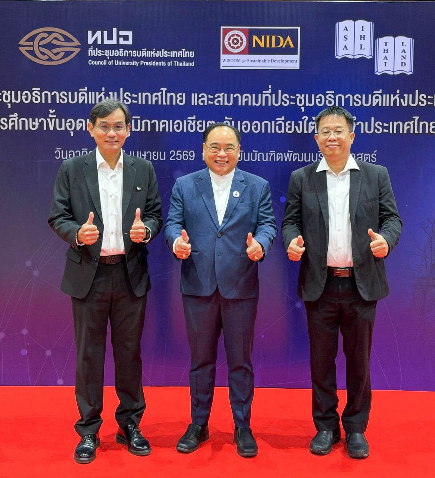 วันอาทิตย์ที่ 26 เมษายน 2569 รองศาสตราจารย์ ดร.วีระพล ทองมา อธิการบดีมหาวิทยาลัยแม่โจ้ พร้อมด้วย ผู้ช่วยศาสตราจารย์.ดร. ประภากร ธาราฉาย รองอธิการบดี , ผู้ช่วยศาสตราจารย์ ดร.สุริยจรัส เตชะตันมีนสกุล รองอธิการบดี เข้าร่วมการประชุมสามัญที่ประชุมอธิการบดีแห่งประเทศไทย และสมาคมที่ประชุมอธิการบดีแห่งประเทศไทย ครั้งที่ 2/2569 , การประชุมสามัญสมาคมสถาบันการศึกษาขั้นอุดมแห่งภูมิภาคเอเชียตะวันออกเฉียงใต้ ประจำประเทศไทย (สออ. ประเทศไทย) ครั้งที่ 1/2569 โดยมี ศาสตราจารย์ ดร.วิเลิศ ภูริวัชร อธิการบดีจุฬาลงกรณ์มหาวิทยาลัย ในฐานะประธานที่ประชุมอธิการบดีแห่งประเทศไทย (ทปอ.) กล่าวเปิดการประชุม ศาสตราจารย์ ดร.ทิพวรรณ หล่อสุวรรณรัตน์ อธิการบดีสถาบันบัณฑิตพัฒนบริหารศาสตร์ (เจ้าภาพการจัดประชุม) กล่าวต้อนรับคณะผู้บริหารมหาวิทยาลัย สถาบันอุดมศึกษา และผู้เกี่ยวข้อง เข้าร่วมการประชุม ณ สถาบันบัณฑิตพัฒนบริหารศาสตร์ (NIDA) กรุงเทพมหานคร
