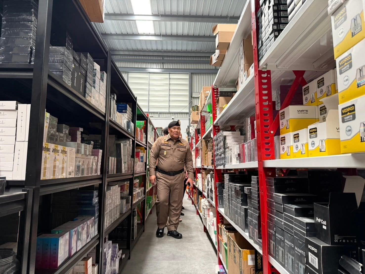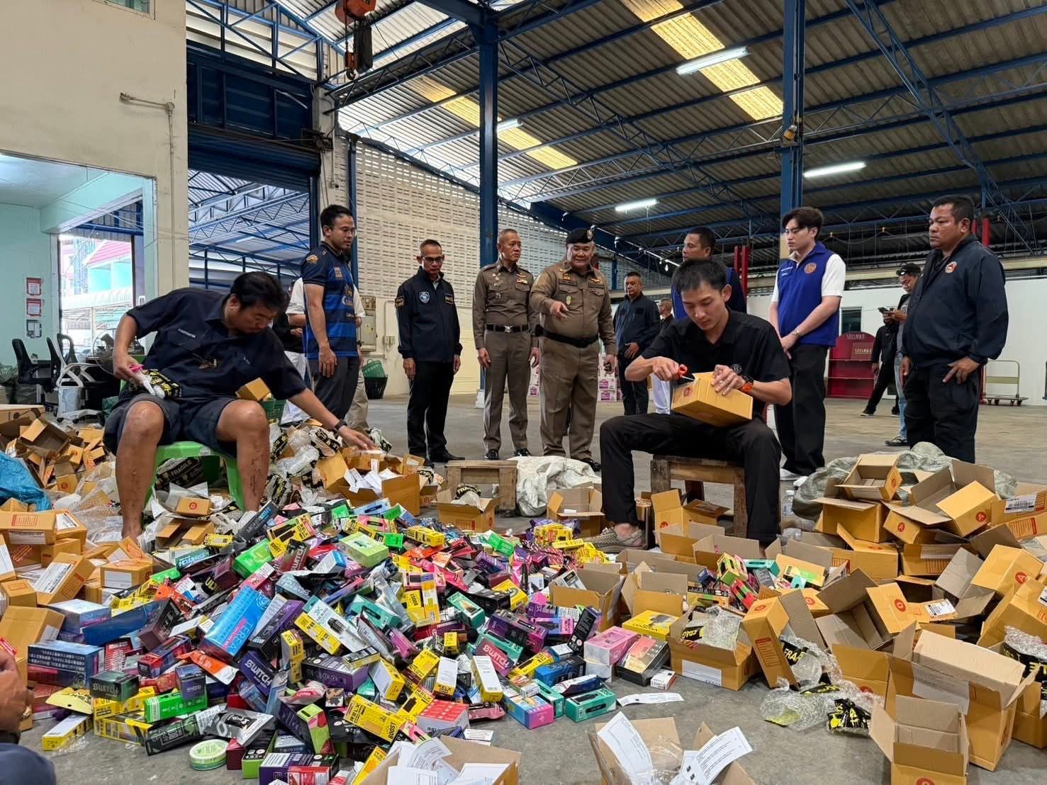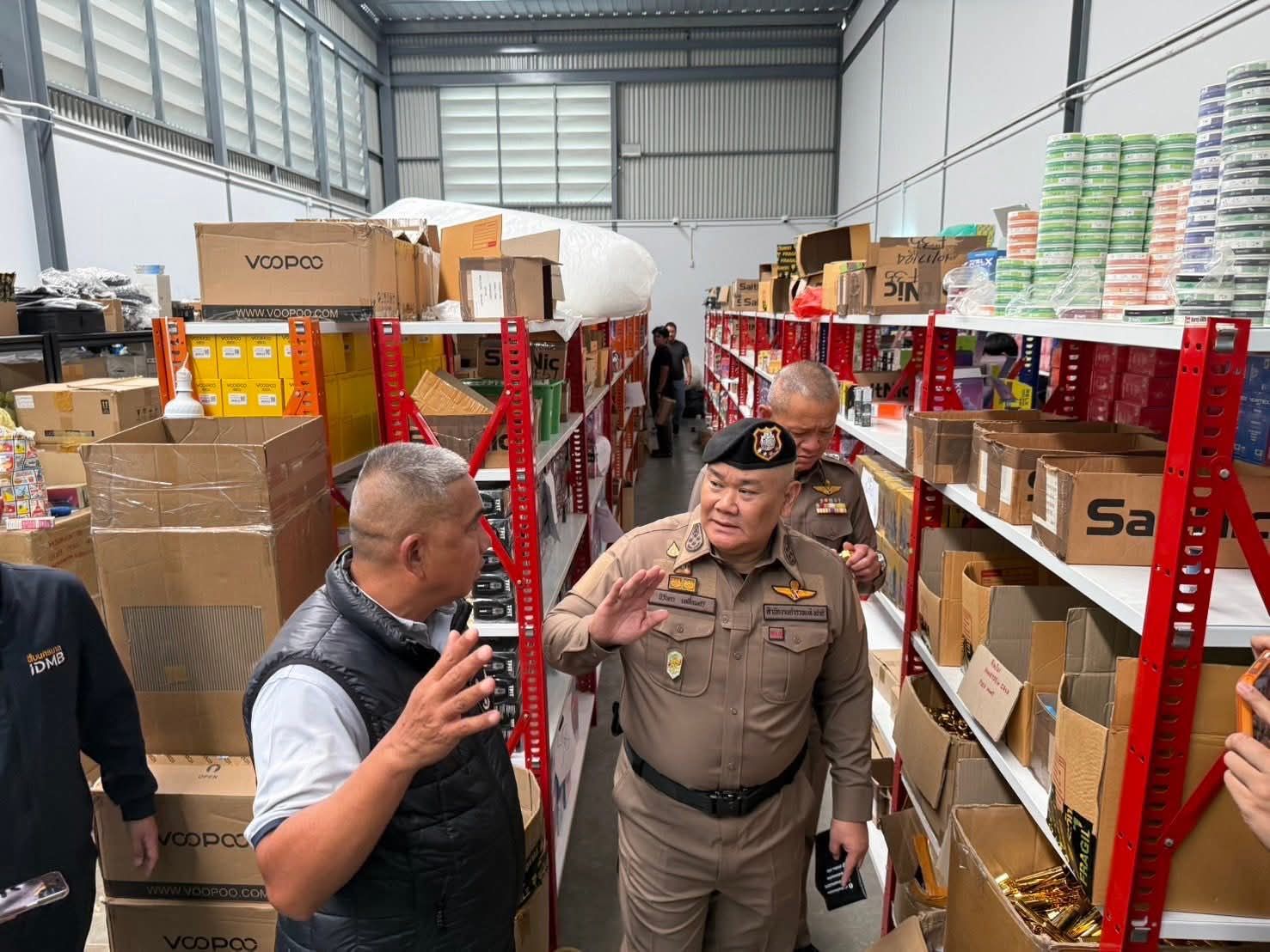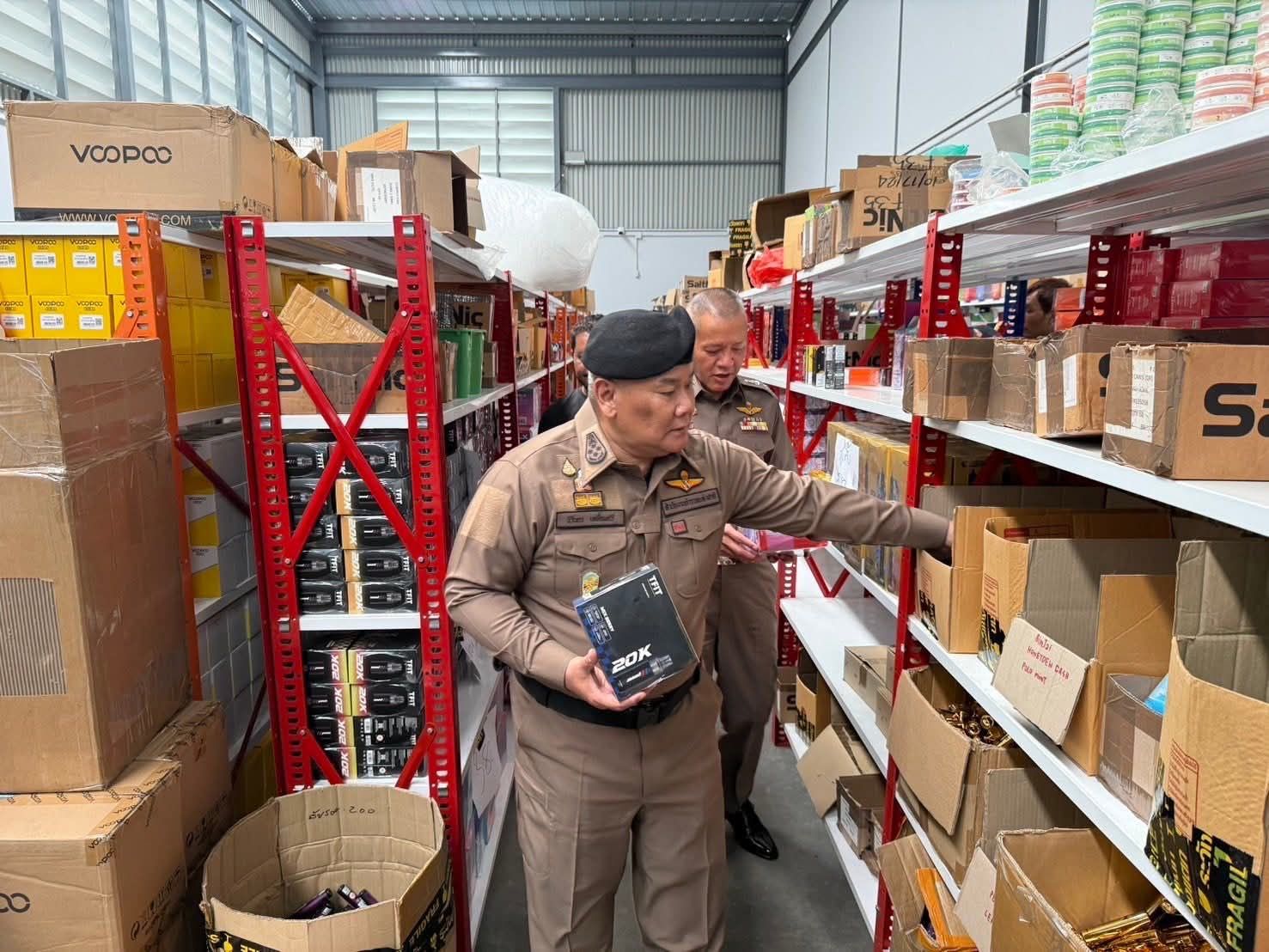 ต่อมา เมื่อวันที่ 28 เม.ย.69 ศปบย.ตร. บช.น. (บก.สส.) และ ภ.1 ได้ร่วมปฏิบัติการตรวจค้นโกดังเก็บสต็อกบุหรี่ไฟฟ้าย่านแพรกษาในพื้นที่ อ.เมือง จ.สมุทรปราการ ซึ่งเป็นปฏิบัติการภายใต้การอำนวยการของ พล.ต.อ.นิรันดรฯ รอง ผบ.ตร./ผอ.ศปบย.ตร. ร่วมกับ พล.ต.ต.ไพโรจน์ สุขรวยธนโชติ รอง ผบช.ภ.1 พล.ต.ต.โชติวัฒน์ เหลืองวิลัย ผบก.สส.บช.น. พล.ต.ต.ภูมินทร์ สิงหสุต ผบก.ภ.จว.สมุทรปราการ พ.ต.อ.สมพล ใจดี รอง ผบก.สอท.2 พ.ต.อ.จักรกฤช ศรีโรจนากูร ผกก.สภ.เมืองสมุทรปราการ ผลการตรวจค้น พบของกลางบุหรี่ไฟฟ้าและอุปกรณ์จำนวนมากกว่า 20,000 ชิ้น รวมมูลค่ากว่า 200 ล้านบาท
