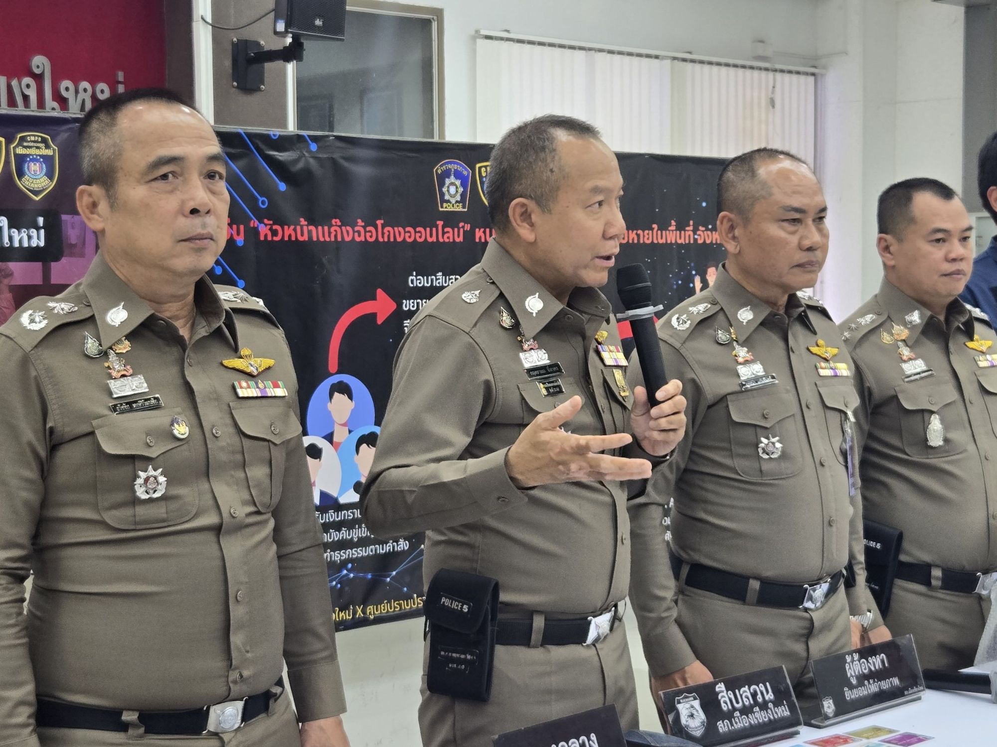 ผบช.ภ. 5 แถลงข่าว รวบแก๊งอั้งยี่จีนเทา! ทลายเครือข่ายบังคับคนไทยทำธุรกรรมโยงบัญชีม้า-ฟอกเงิน